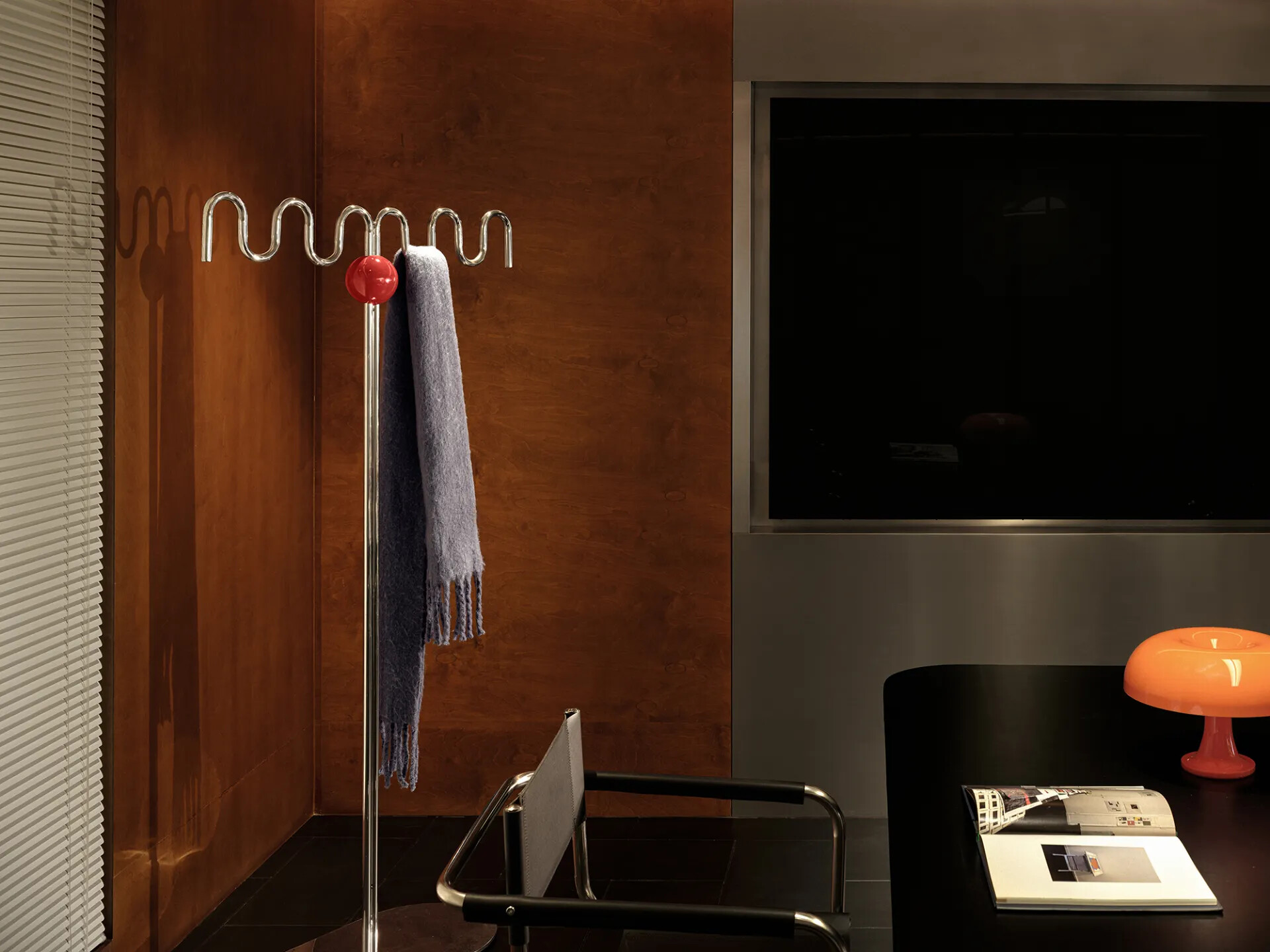 當您考慮在下一個十字路口可能看到的東西時,不要著急,而是慢慢打開帶有圓形窗戶的木門。白色百葉窗、復古溫暖的木質色調和一些不尋常的形狀的傢具圖案構成了這個獨特而奇特的會議空間,與會議中經常令人沮喪和沉悶的氣氛以及僵硬的規則形成鮮明對比。也許這就是設計師想要通過空間表達的幽默感。