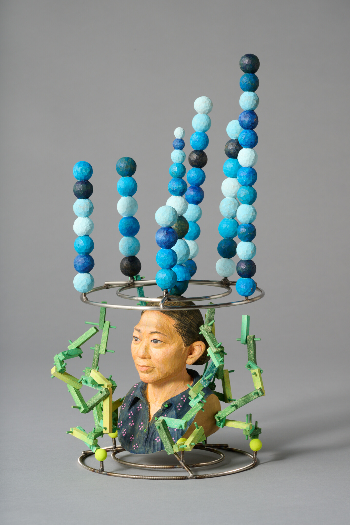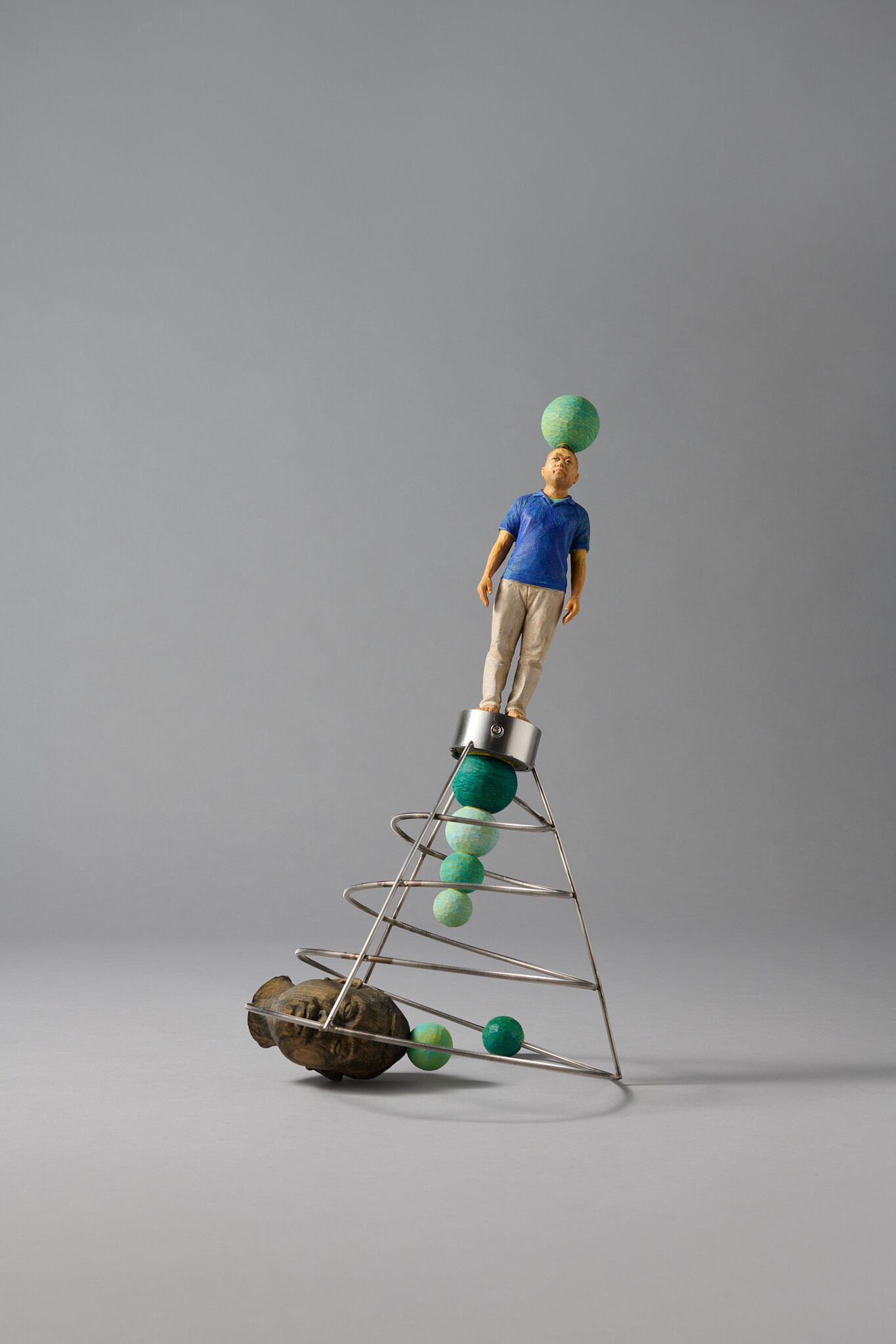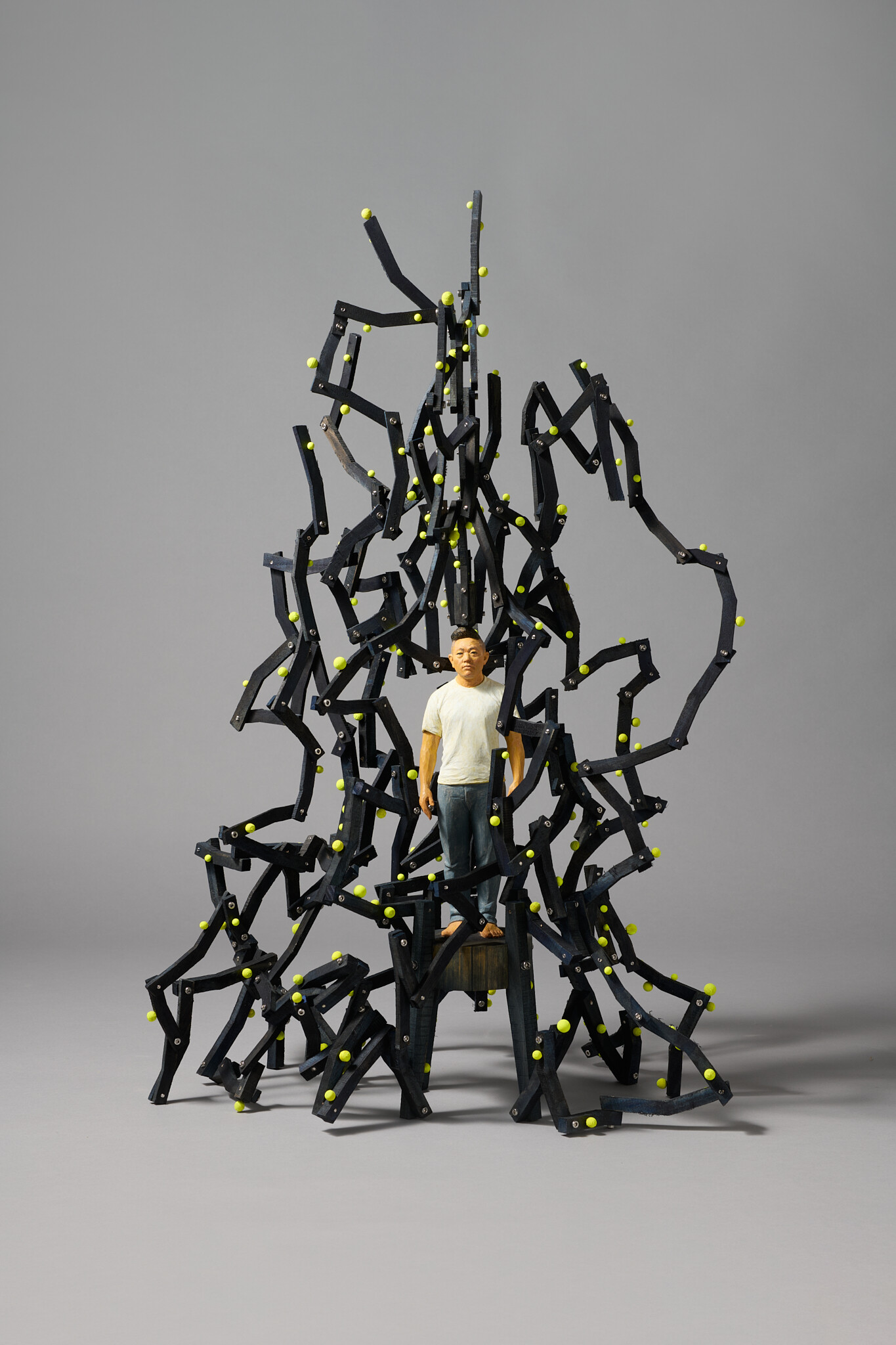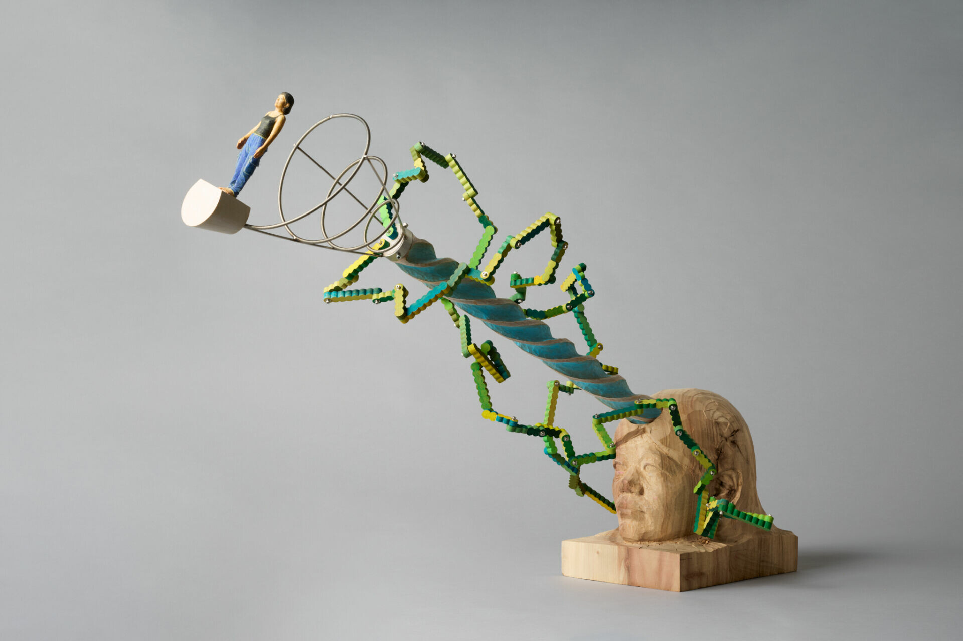 創作的發軔,從決定好要雕刻哪個人開始,繼而潛心回憶、反覆思索其樣貌與質地,然後,再將「某些東西」與他組合。他並非總是由一整塊木頭中鑿出形體,也會耐心地鑿刻、打磨出數十個獨立的木頭零件,有時是圓潤的球體,有時是長長短短的方形木條,甚至是纏繞的金屬支架。接著,他以近乎建築的方式,將這些零件一一串連、栓合、組裝起來。於是,人物性格中那份風雨無阻的勇敢、天馬行空的奇想,或是對世界充滿魄力的好奇都找到了對應的幾何語彙,化為構築風景的基石。