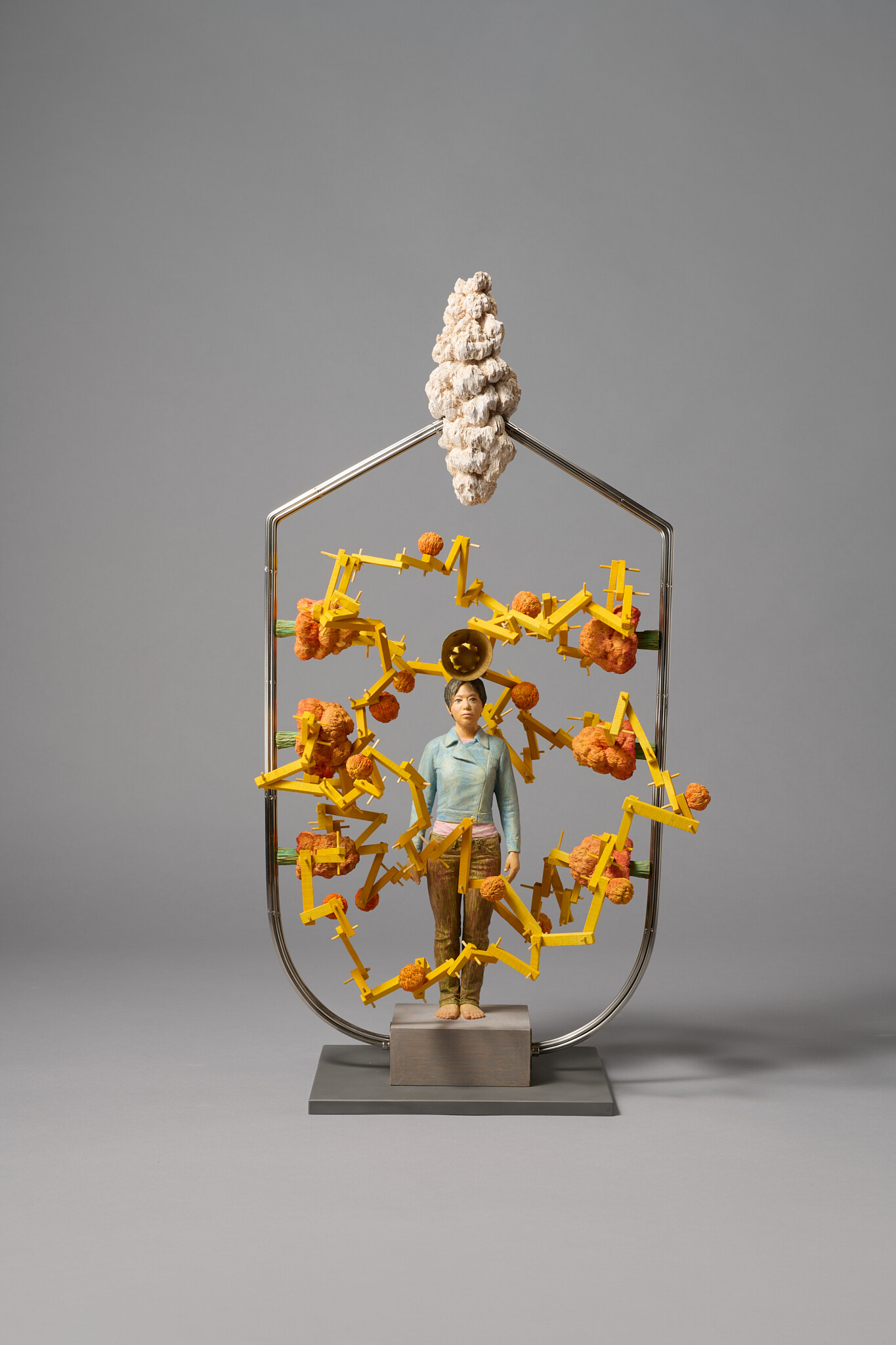 泉啓司更大膽地為這些木質結構漆上飽滿、鮮明的色彩。溫潤的木頭原色之上,出現了明亮的橘、搶眼的螢光黃、沉靜的藍與生機的綠。色彩,賦予了這些抽象的幾何結構一種情感的溫度與個性,讓它們脫離了純粹的形式,成為思想、情緒或關係的視覺化身。於是,我們看到,一道道飽和色的、戲劇性交織的思緒從一顆木刻人形中爆發開來,也化作團團熾熱火光;或是蒼蒼雨幕傾天而降、蔥蔥樹林拔地而生,共同織就色澤萬千的景象。「我在思考『人是什麼?』的過程中,一個像風景的畫面,會自己悄然幻化成形,」泉啓司說,「那不是傳統的山與海,而是一種從人物內心長出來的精神地景。」泉啓司邀請我們觀看的,不僅是木雕中的人,更是那圍繞著他、從他身上綻放開來,由無數零件與色彩共同構築的風景。