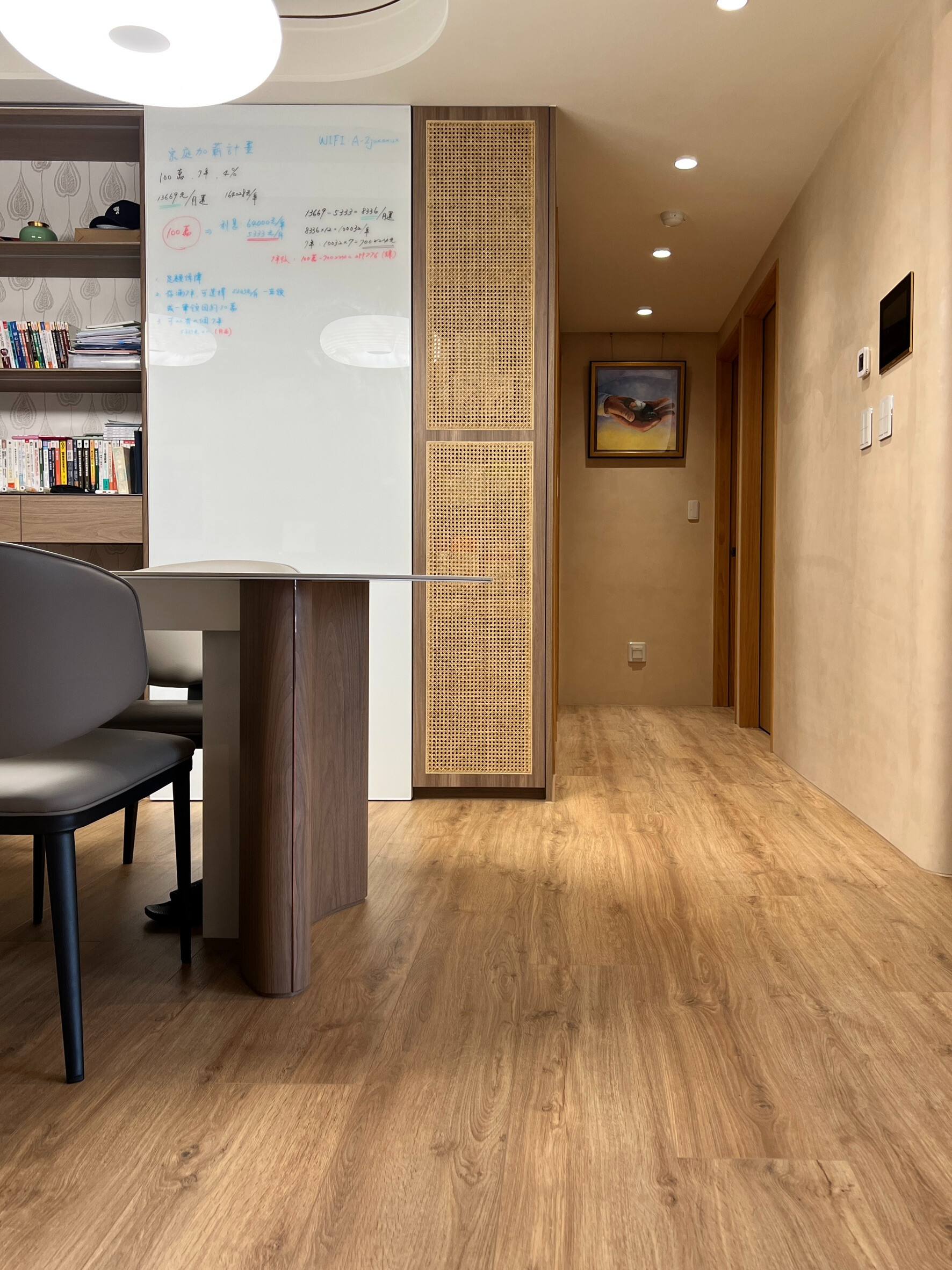台中共構設計吳君星設計師在空間中留下了彈性。客廳電視可旋轉角度,當餐桌成為會議桌時,螢幕便能成為投影畫面;開放式廚房的櫃體門片特地以可書寫的白板材質製成,能隨手記錄討論重點。當會議結束、鍋裡開始冒著熱氣,家又回到溫柔的節奏——那是工作與生活自然交融的樣子。