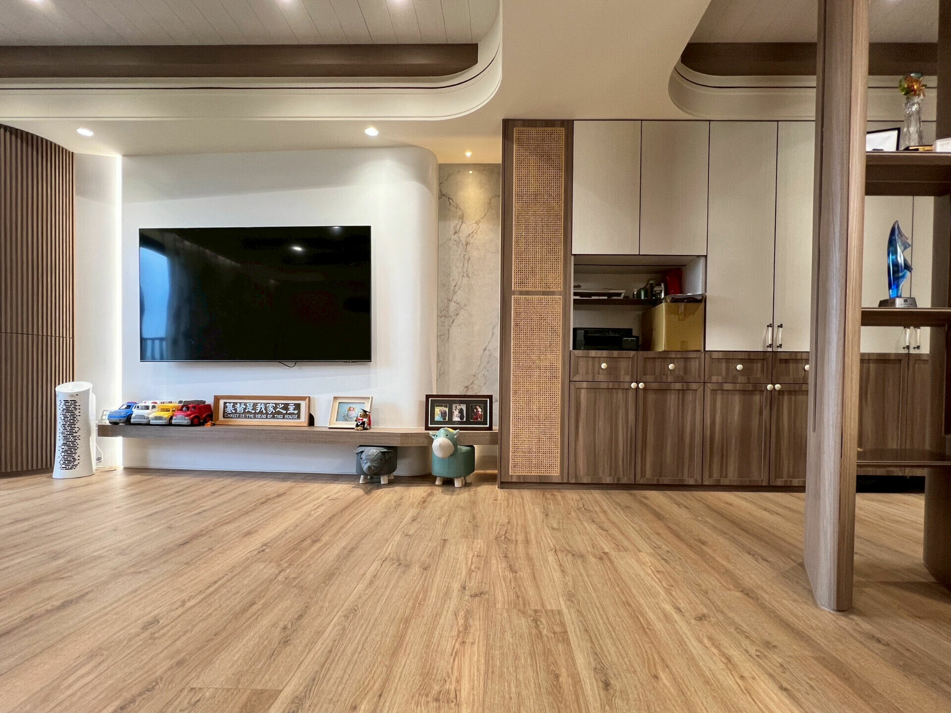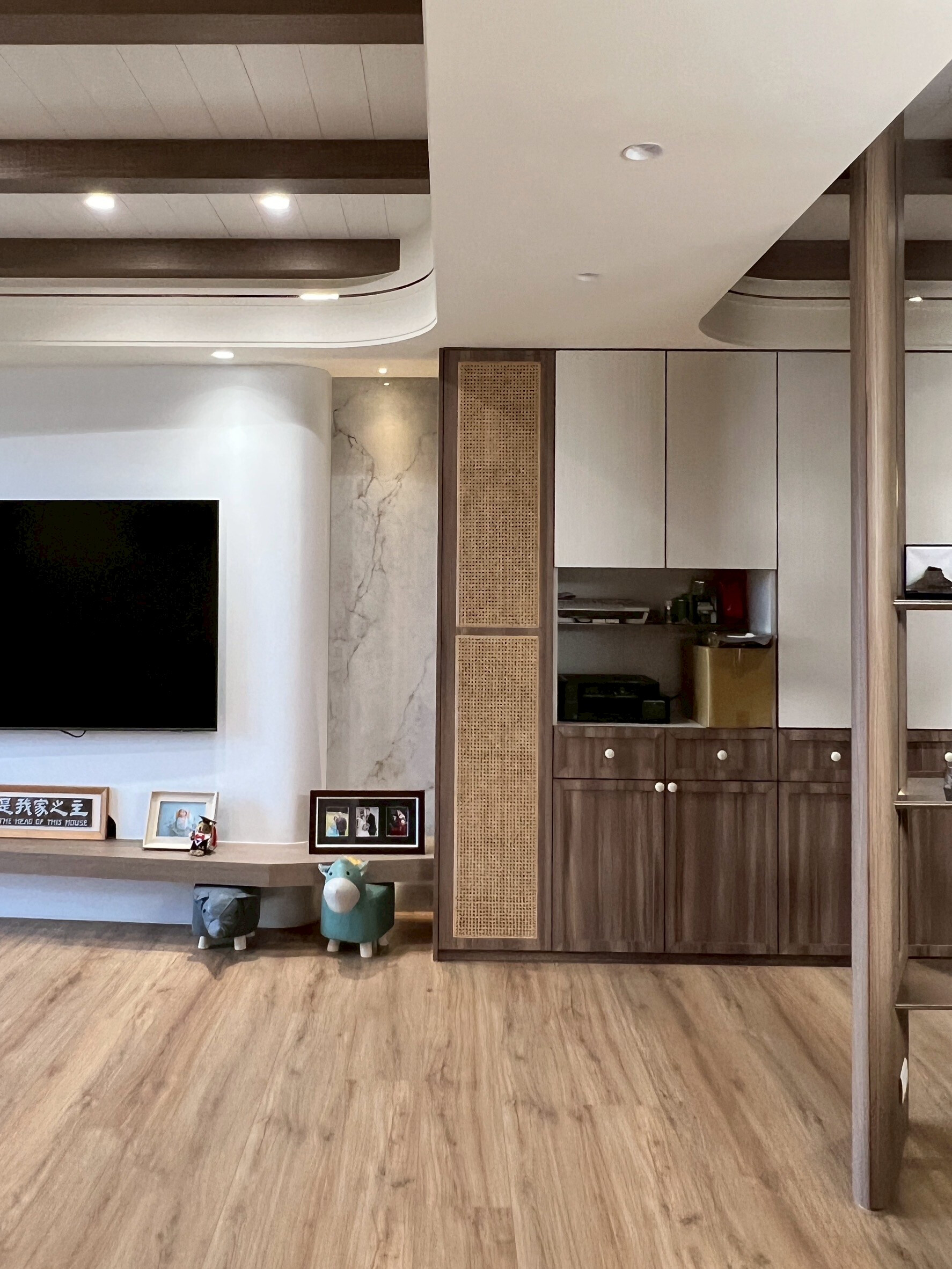 女主人喜歡鄉村風的溫潤質地,男主人偏好中式的靜謐與秩序。設計師選擇以現代人文風作為語言,讓兩種特質在同一個空間裡共鳴。