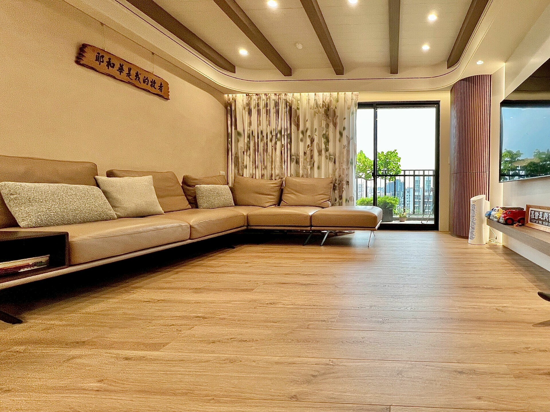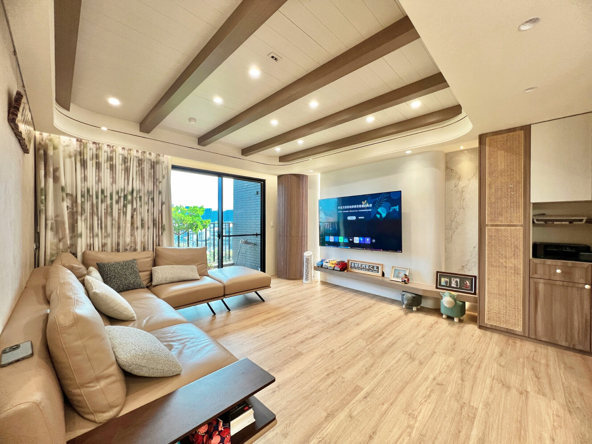 天花板上以實木橫樑作為裝飾,不僅營造出自然溫潤的鄉村氛圍,也巧妙地劃分了不同空間的層次。木質橫樑的橫向線條,延展了整體視覺感,讓客廳顯得更加寬闊大器。