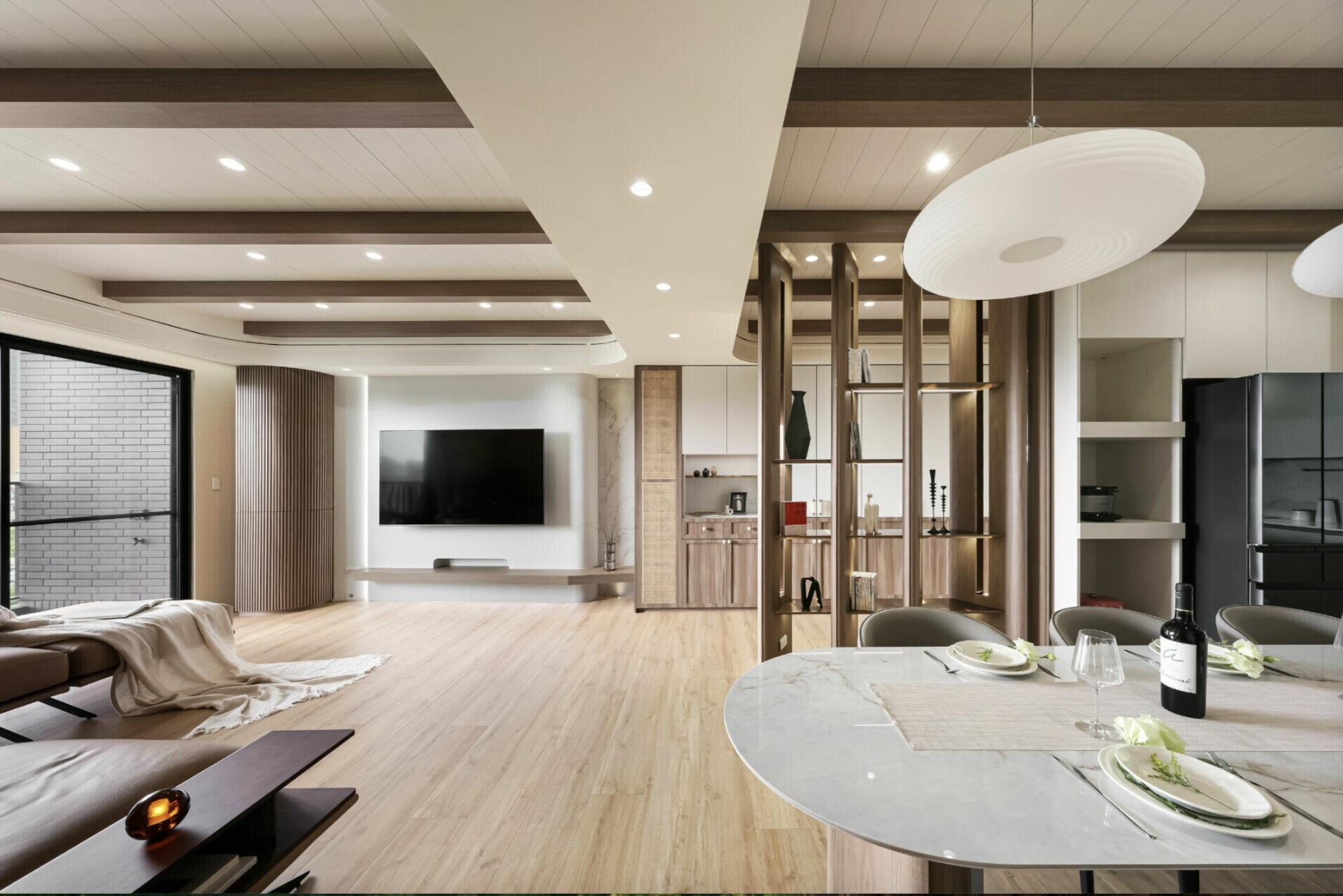 餐桌上方的吊燈則融入東方意象,金屬與光影交織出柔和的禪意。整體色調介於淺木、灰與米之間,乾淨而柔軟,不爭不搶,卻能包容兩人的生活節奏與美學好。