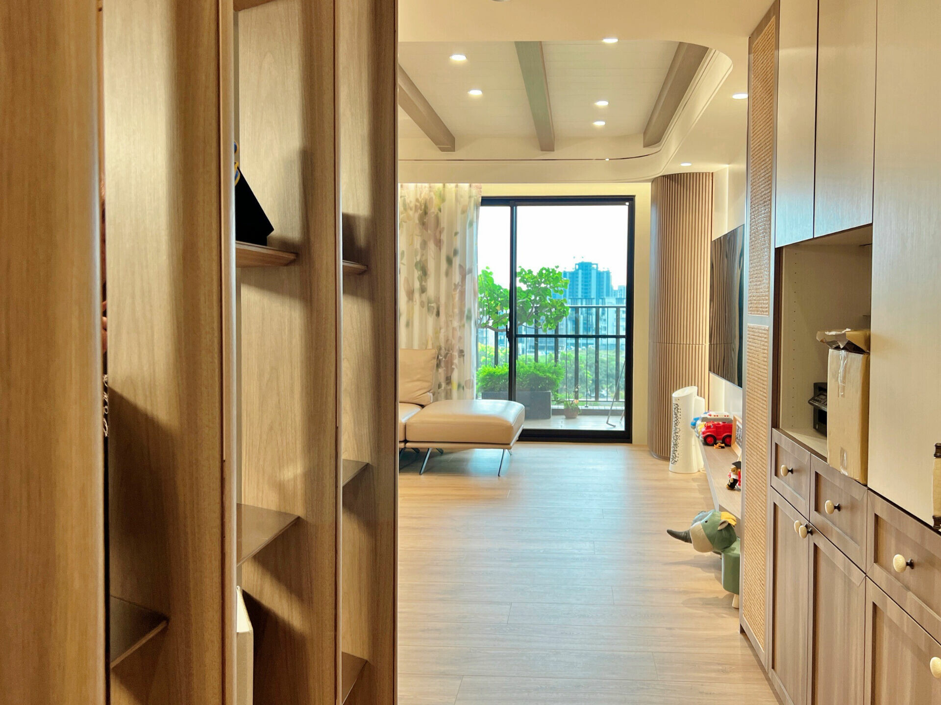 玄關的格柵櫃體以木作結構搭配鍍鈦金屬線條,讓光線在邊緣處閃出一抹溫潤的光澤。午後的陽光從落地窗傾灑,木皮紋理的深淺隨時間變化,每個角度都像一幀靜靜流動的畫。這裡沒有繁複的裝飾語彙,只有材質之間彼此對話的節奏感。