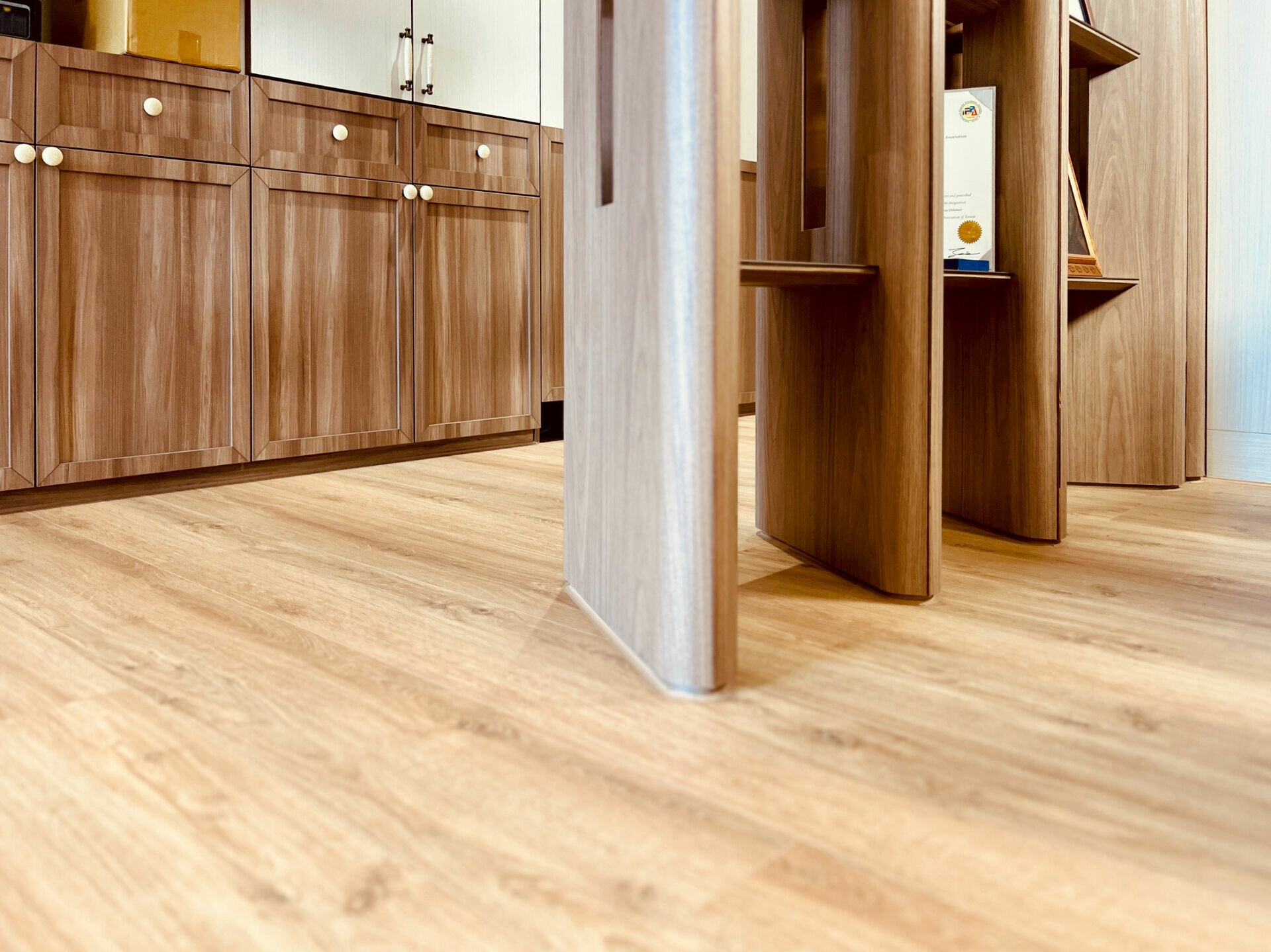 大尺度板材拉出俐落的水平線條,也延伸了整體的空間感。榛果橡木的色澤溫和、帶著微灰的中性調,讓家具、布面或金屬件都能自然融入,在光影變化下呈現出柔順又有層次的紋理。