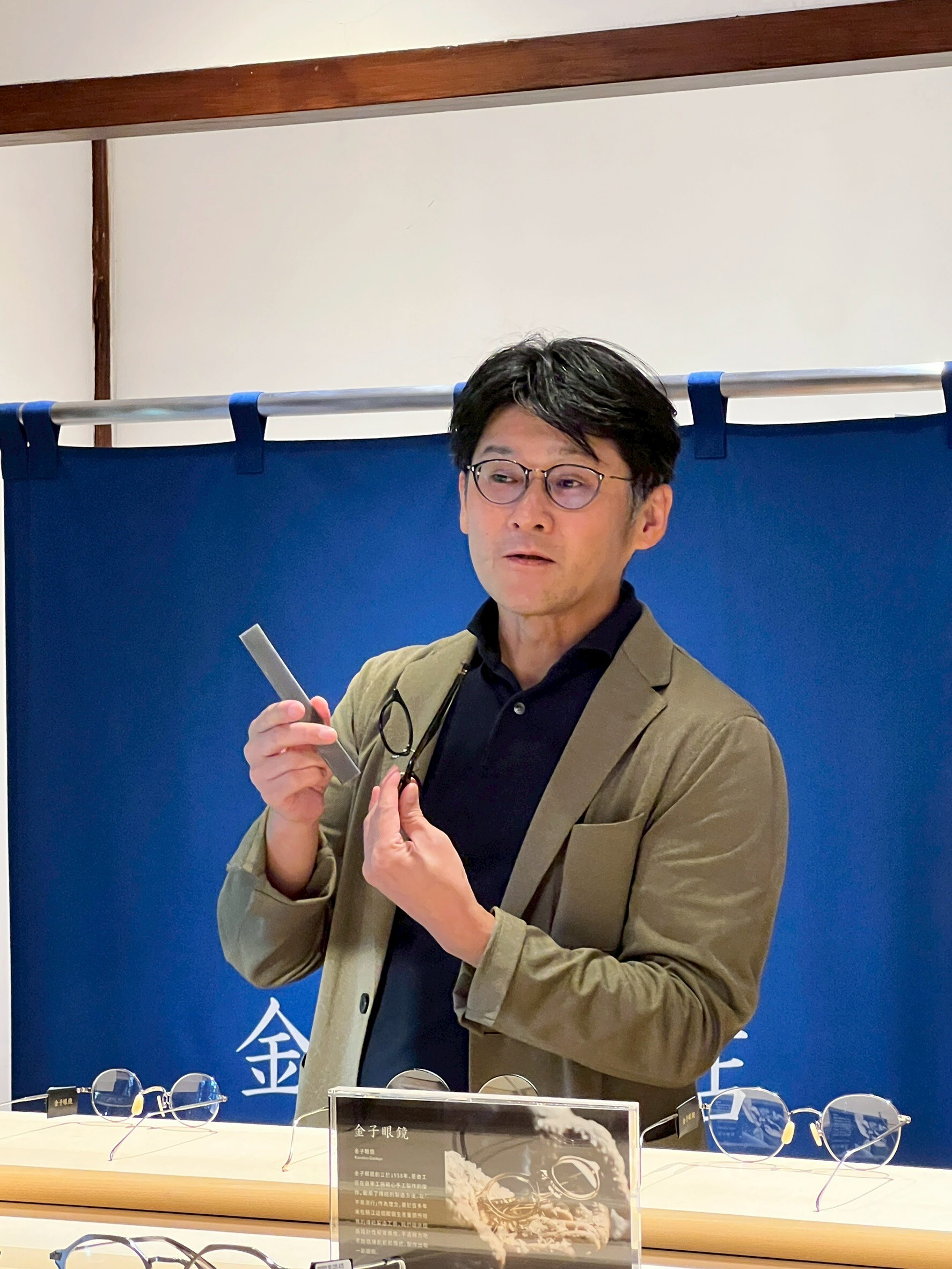 每一副 KC 鏡框都需經手工打磨數十道工序,鼻托與鏡框一體成形,無法調整,因此試戴時更顯重要。象徵的是「時間與手感的美」,也是金子眼鏡最純粹的起點。