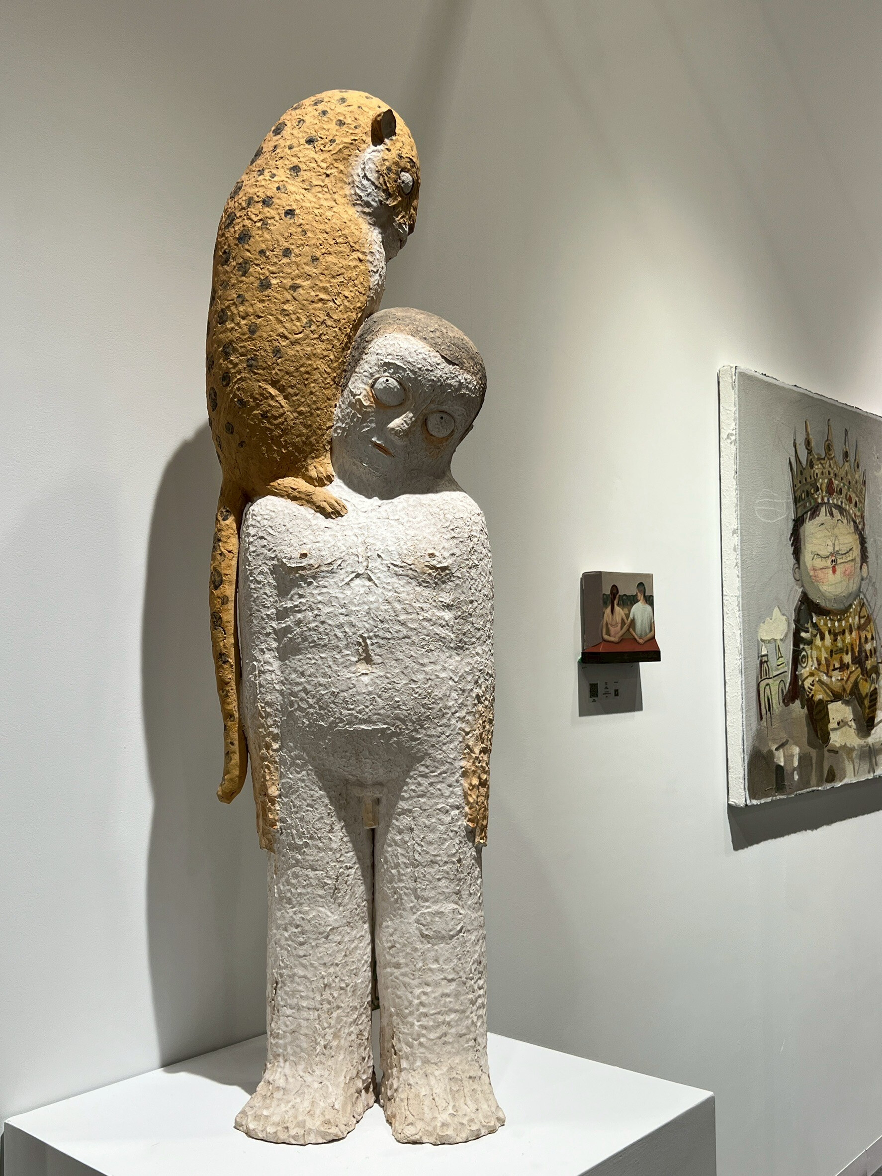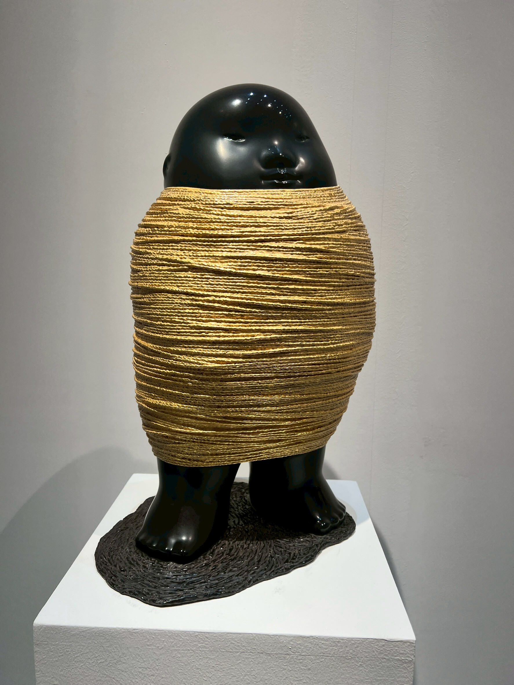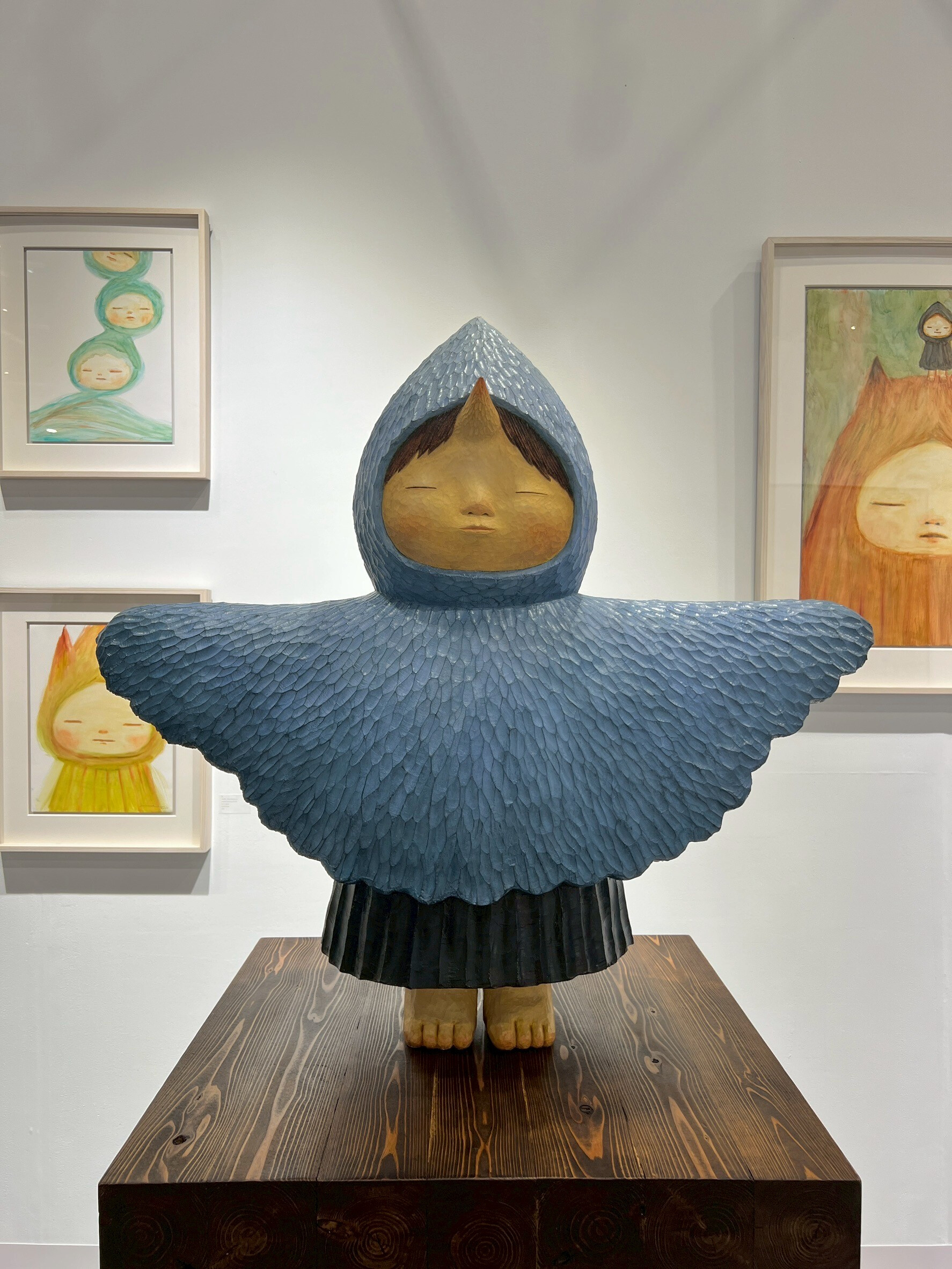 她以木雕為主要創作媒材,將傳統手工雕刻結合當代美學語彙,在日本及國際藝壇掀起一股「療癒系雕塑」風潮。其作品常以孩童般的角色為主體,閉眼、靜默、似夢非夢,蘊含柔軟卻深邃的情感張力。藍色羽翼:象徵守護與自由,也傳遞一種內在的平靜。