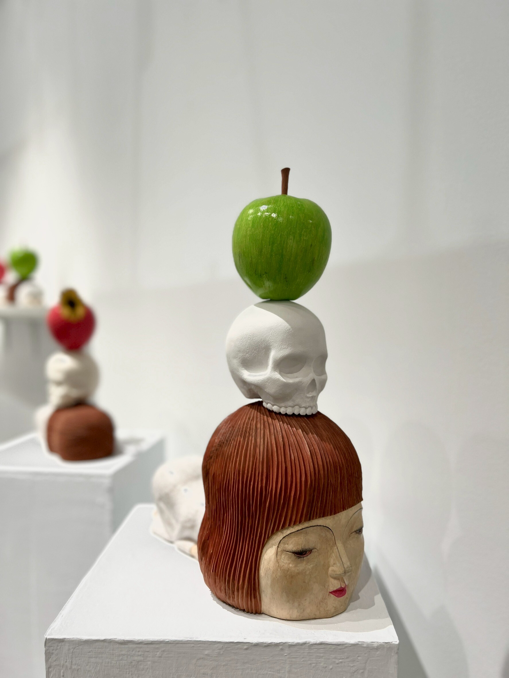 日本藝術家 手嶋大輔(Daisuke Teshima, 1977–)。他畢業於東京造形大學(Tokyo Zokei University),現居日本,是近年在亞洲藝博會中備受關注的當代雕塑家之一,由 Soka Art(索卡藝術) 代理展出。手嶋擅長以手工雕刻的木頭肌理呈現頭髮與肌膚的溫度,並用細膩的上色模糊現實與夢境的界線。例如: 頭上長出花朵的女孩:象徵思想萌芽、生命再生。疊放骷髏與蘋果的造型:暗示「死亡之上仍有生命」,是一種關於時間與輪迴的寓言。
