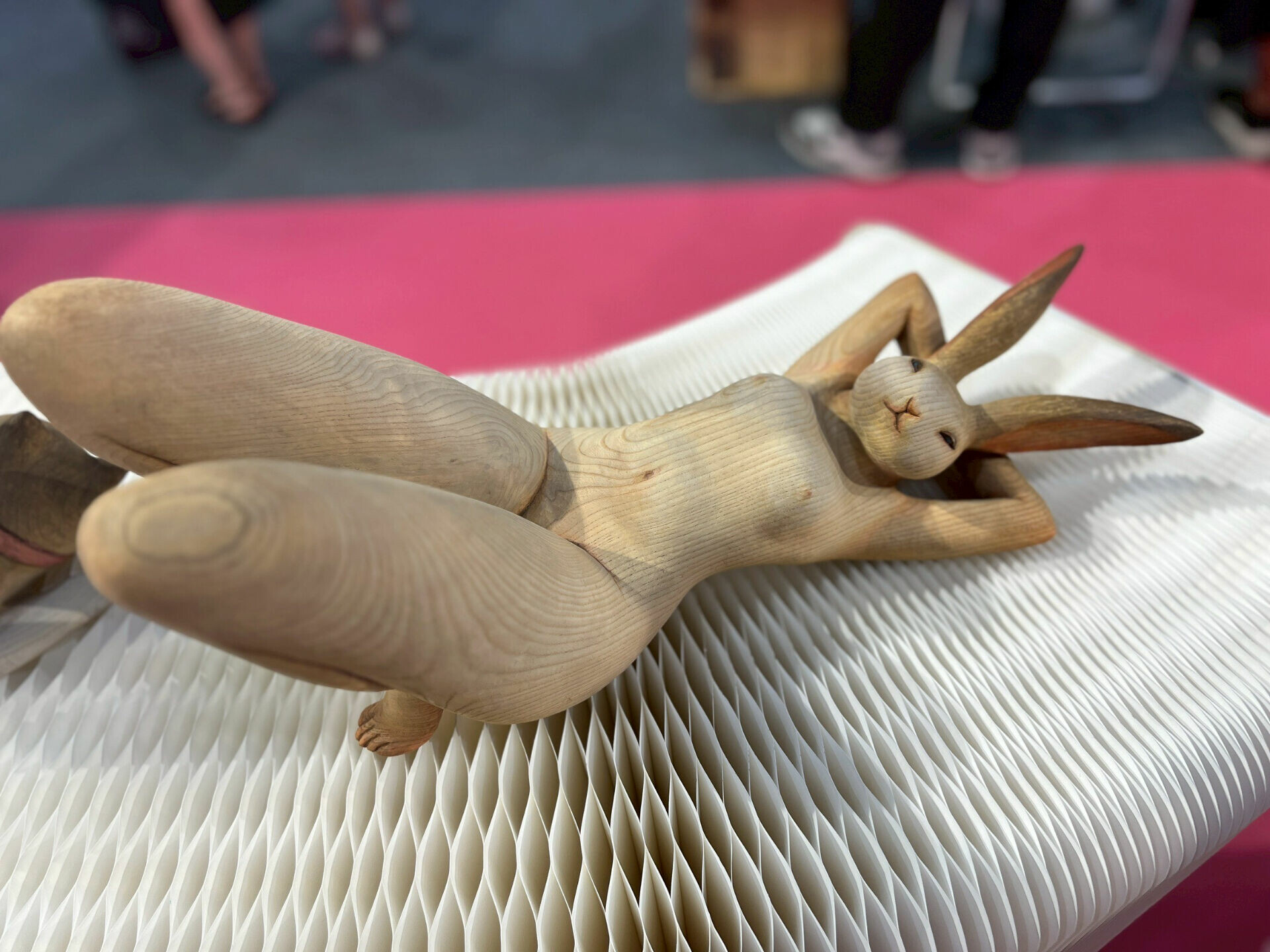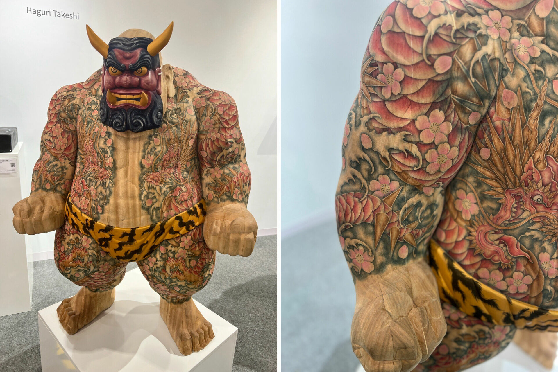 日本雕刻家 Haguri Takeshi(羽栗剛) 的木雕創作。他的作品融合傳統與現代,充滿戲劇性張力,人物造型誇張卻不失穩重,常搭配面具與全身刺青,呼應日本能劇、祭典與浮世繪文化。刺青部分多由協作者長崎美紀手工描繪,使木雕更具層次感。