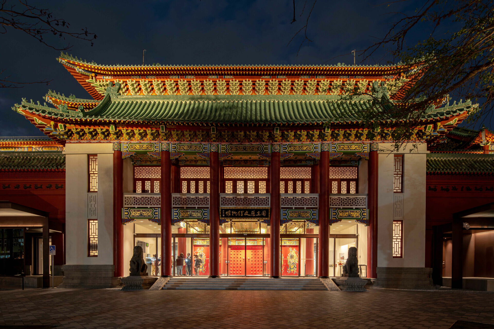 歷時多年整修完成的「國立歷史博物館」,位於南海學園一隅,紅牆綠瓦見證戰後臺灣的文化脈動。燈光設計以隱匿投光與精準配光,展現修復後傳統構件的迷人風采:屋脊細光勾邊,斗拱與彩繪層次盡顯,紅牆綠瓦散發溫潤光澤,藉由暖光襯托飛檐、斗拱與琉璃瓦等建築特色;新設玻璃迴廊與輕鋼坡道,則以微冷光勾勒通透輪廓,與厚重宮牆形成對比,幕牆後的朱紅牆體若隱若現,凸顯新舊並陳的視覺敘事。透過交織的光影,讓館舍化作植物園畔一盞含蓄燈籠,靜謐、和煦卻不炫目。