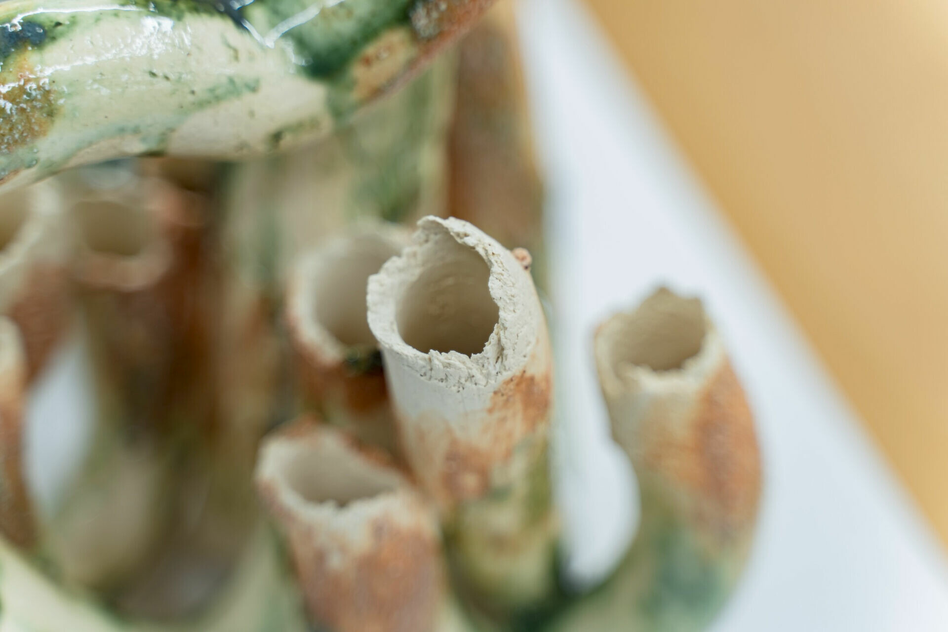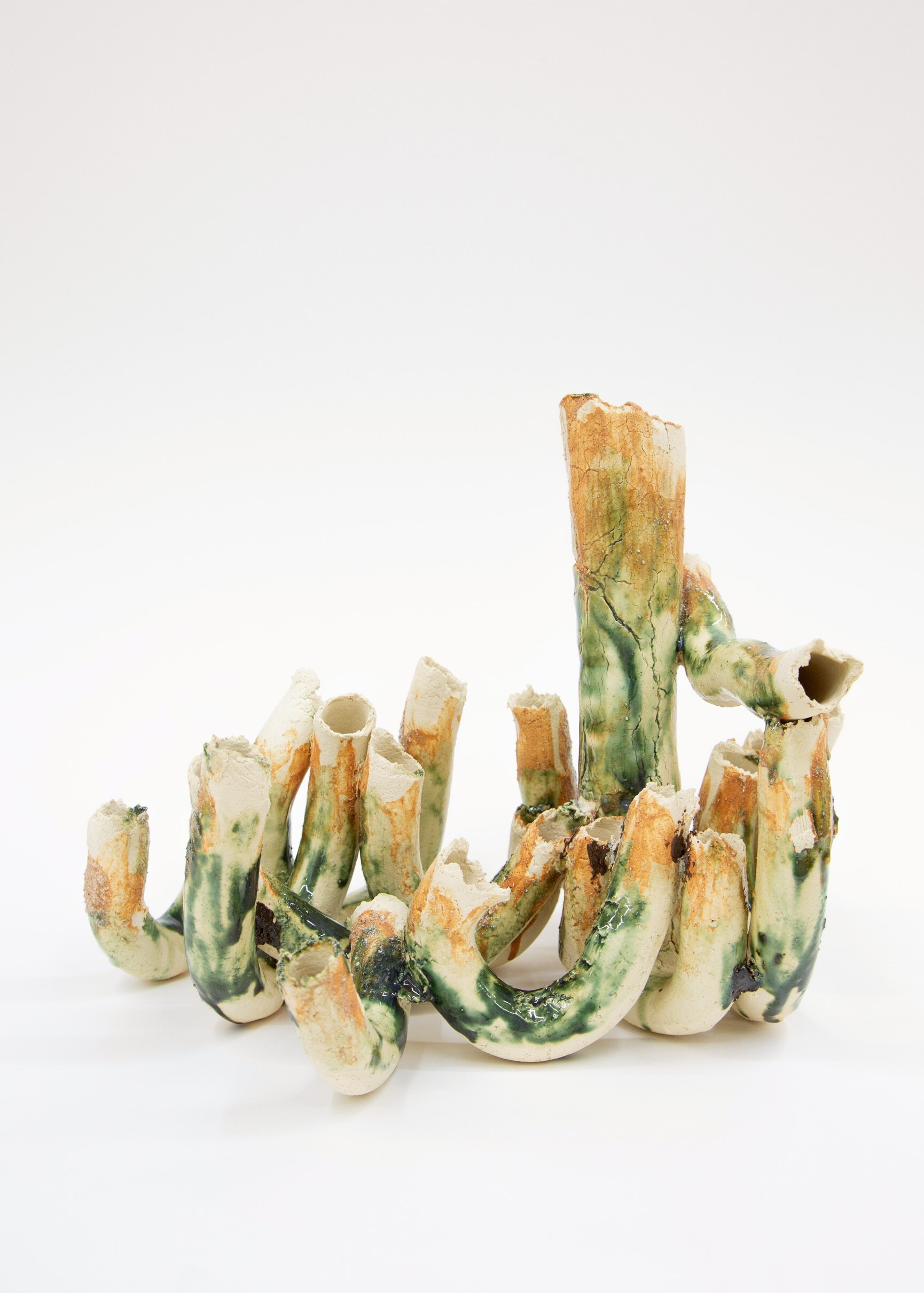 此次展出的「聲譜」系列,以 2018 年於橫濱的水下錄音創作計畫為起點,展出約二十餘件取材自不同水域聲音與土壤的雕塑與畫作。《湄南》延續這項創作脈絡,也展現蔡坤霖在材質上的轉變。相較於過去以 PVC 水管構築的工業裝置,此次他以陶土為主要媒介,並在錄音現場取土混入陶土中,讓土地的氣息與聲音的軌跡共存。土、水、火交融的過程,使每件作品皆帶有環境的痕跡與不可控的變化,形成如同聲音回響般的肌理。陶土成為「聲音的共鳴體」,承載著時間、記憶與地理的能量。這些雕塑因此帶有土地的氣味,也帶有聲音的痕跡。不同土質在高溫燒成後,與釉藥產生意想不到的化學變化,形成獨一無二的色彩。