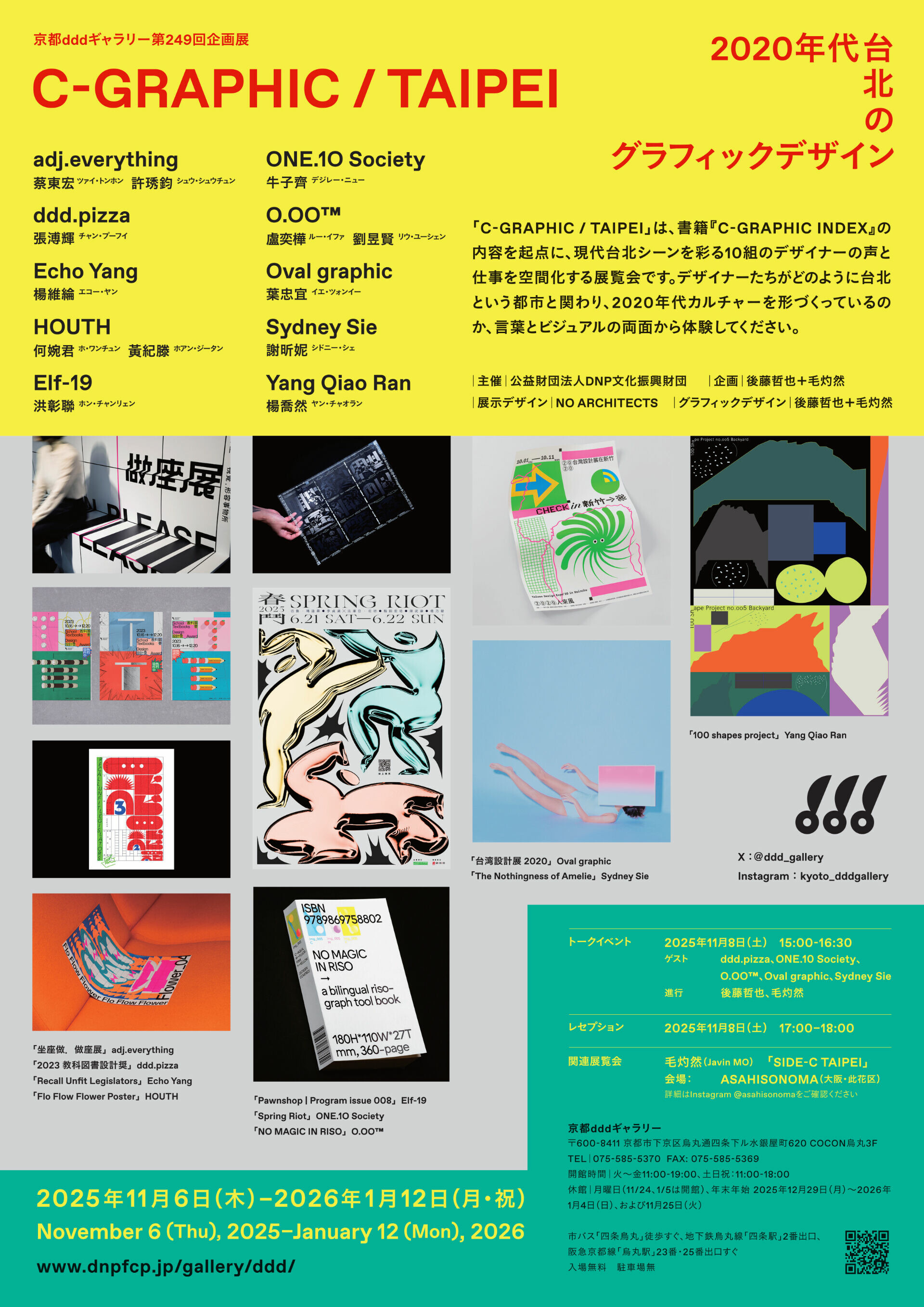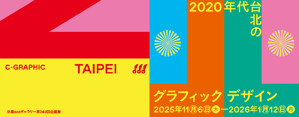 繼 2024年《C-GRAPHIC INDEX》一書,有系統介紹活躍於漢字文化圈的當代設計師後,由後藤哲也(Tetsuya Goto)與毛灼然(Javin Mo)策劃的「C-GRAPHIC/TAIPEI —— 2020年代台北平面設計展」(C-GRAPHIC/TAIPEI: Taipei’s Graphic Design Scene in the 2020s)已於日本平面設計指標空間京都 ddd gallery 登場,將書中的概念延伸至實體空間。同時也是自 1998 年後「Taiwan 4 Exhibition」,闊別 27 年後,再度有以台灣設計師為主題的展覽。一共呈現 10 組以台北為據點的平面設計師和工作室,包含形容事物所 adj. everything(蔡東宏、許琇鈞)、ddd.pizza(張溥輝)、Echo Yang(楊維綸)、EIf-19(洪彰聯)、HOUTH(何婉君、黃紀滕)、O.OO™(盧奕樺、劉昱賢)、ONE.1O Society(牛子齊)、Oval graphic(葉忠宜)、Sydney Sie(謝昕妮)、Yang Qiao Ran(楊喬然)等。