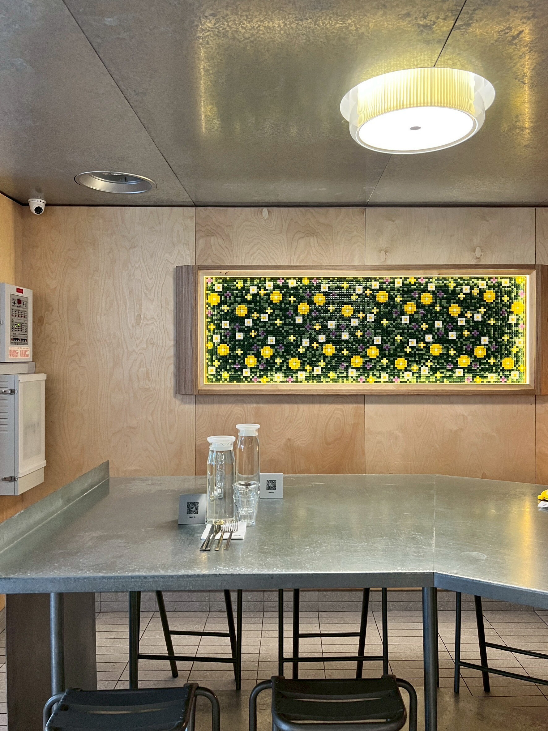 一旁的開放廚房傳來鍋鏟的撞擊聲,那是最日常的聲響,也是空間最具生命力的背景音。走到轉角時,一幅馬賽克作品映入眼簾——綠草地與小黃花的佈景像是窗外天母街樹的延伸,把戶外的自然溫潤靜靜帶進室內。