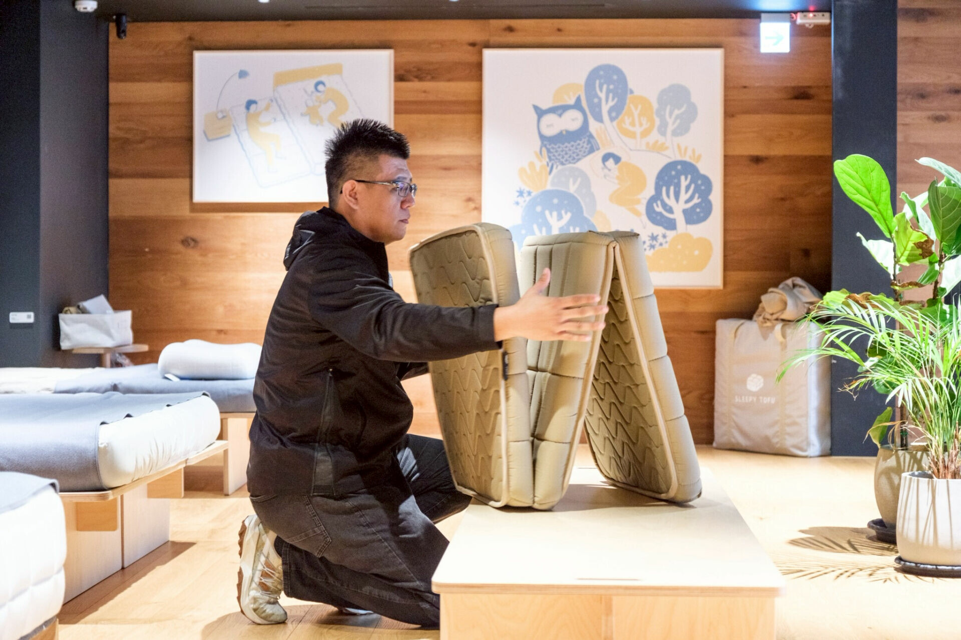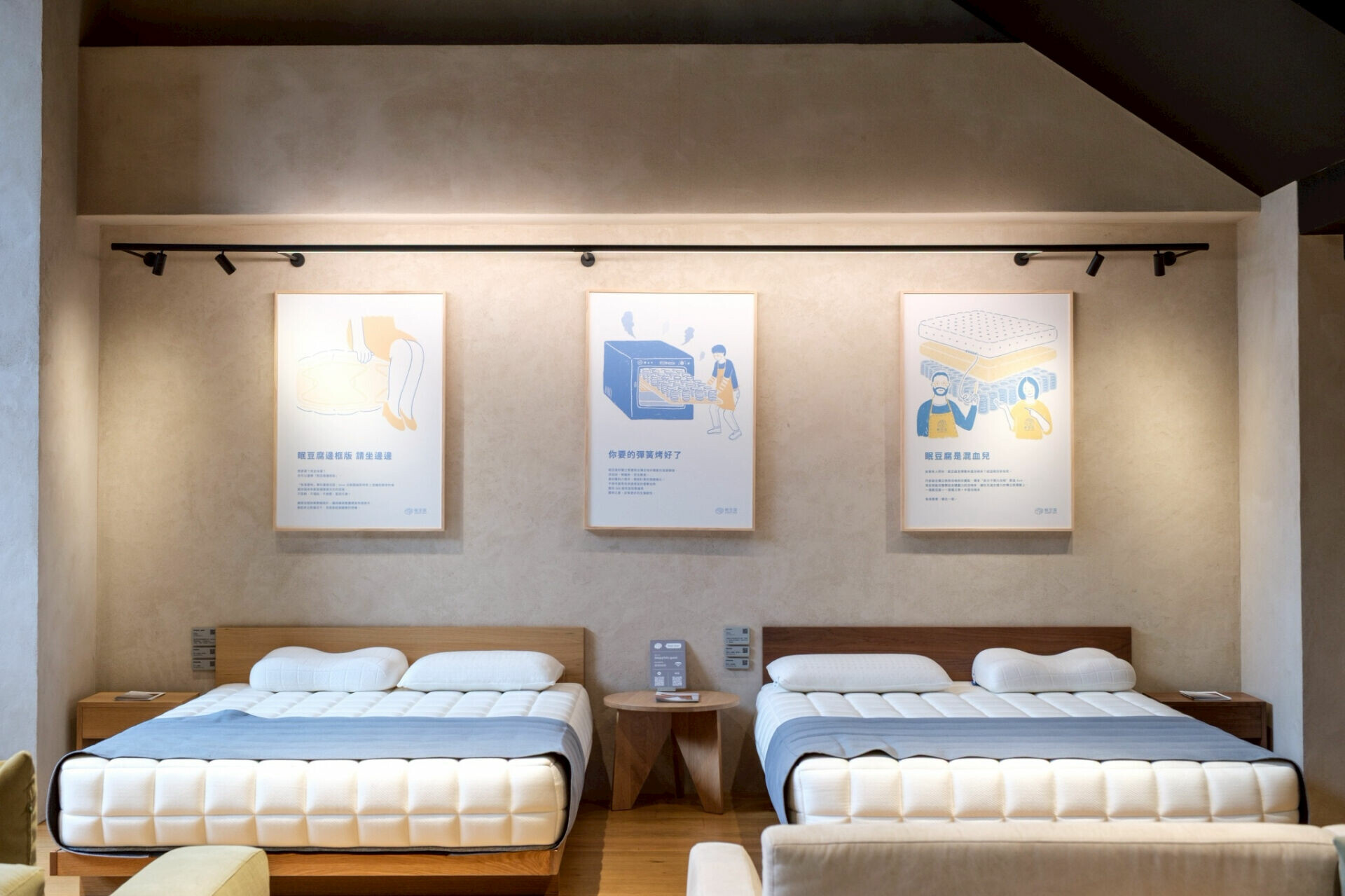 在門市能好好試躺之外,眠豆腐買回家後也提供100晚試睡,不喜歡可回收床墊並全額退費。對很多客戶來說,這種服務與保證大大降低了選床的心理壓力,來到店裡比較一輪,通常就能找到最喜愛的那一款,並且無壓力地帶回家。吳君星設計師分享,目前最多客戶選擇的,是偏硬的芝麻豆腐,不軟塌又能讓全身肌肉放鬆,往往讓人一躺下就不想從床上起來呢。