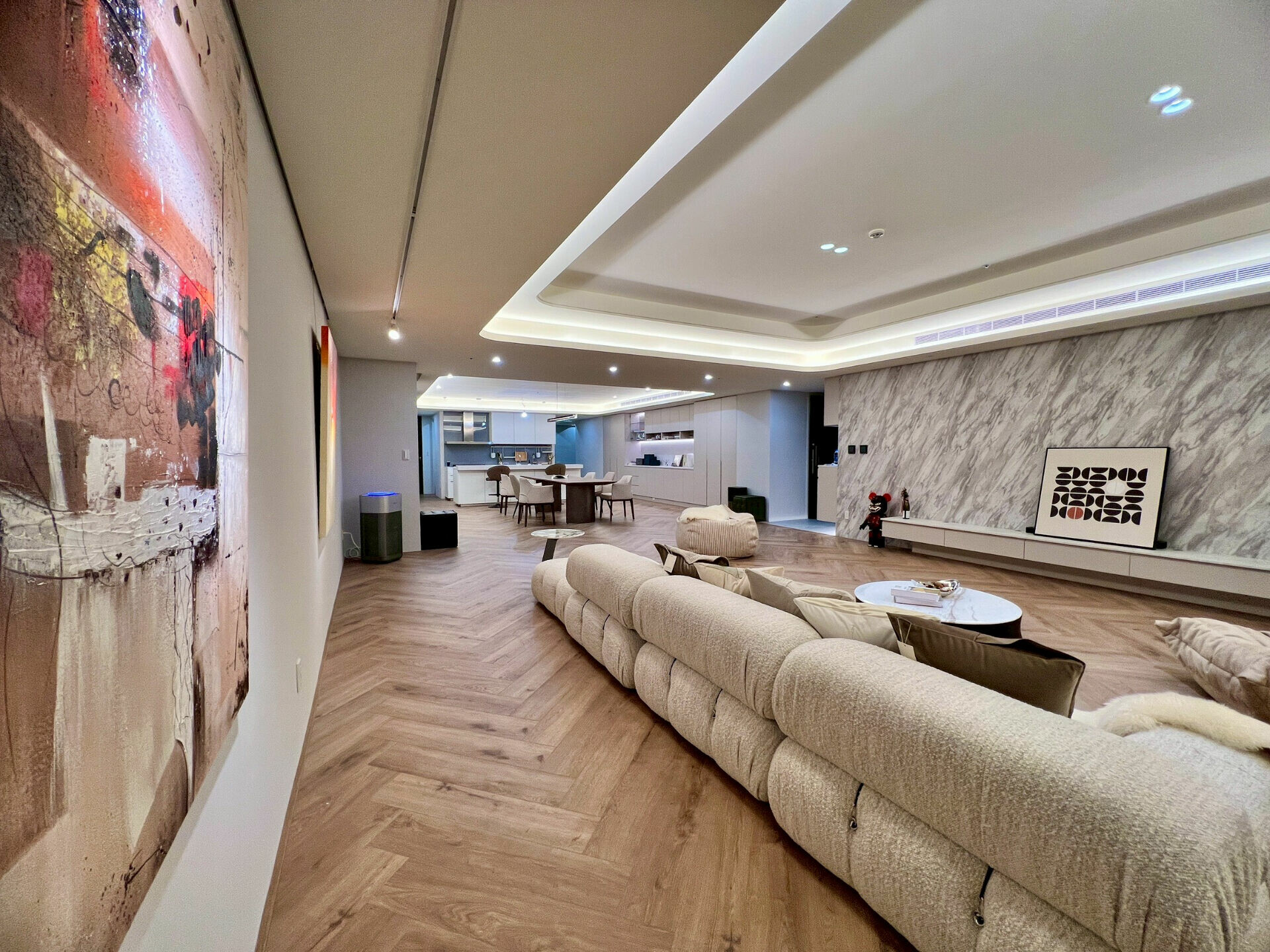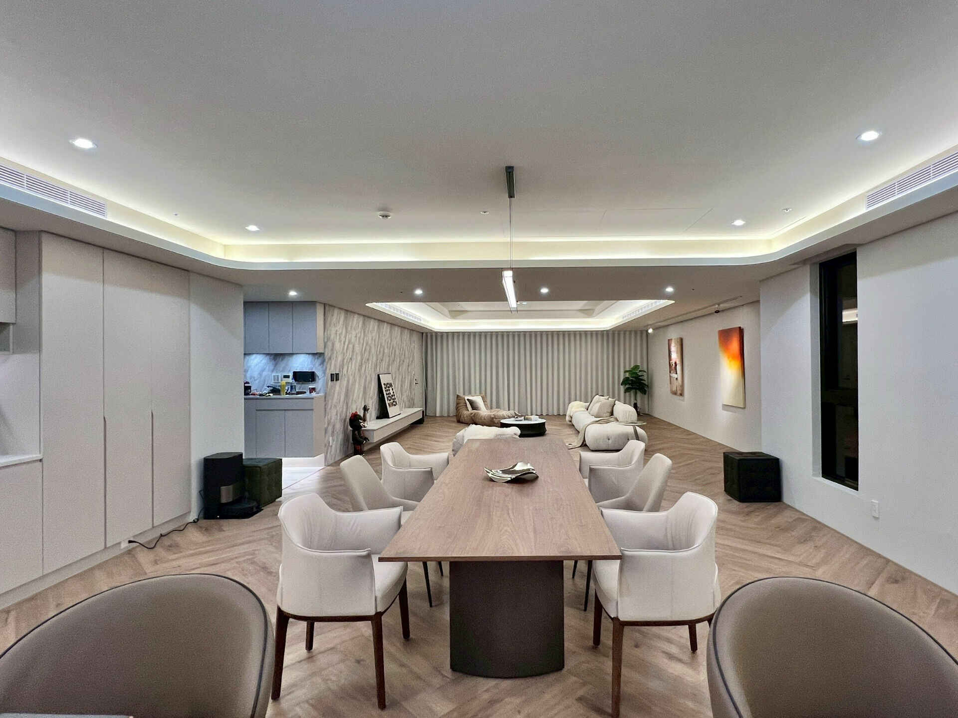 本案位於台北精華地段,92 坪、三加一房的格局,屋主是對環保與綠建材有高度共識的年輕家庭。設計風格並未追求張揚的造型語彙,而是將預算與心力投注在看不見、卻最關鍵的地方:室內空氣品質的完整佈局,採用全戶除濕系統、冷暖空調整合規劃、全熱交換以及全室牆面選用德國的礦物塗料得以調節濕氣是無毒的健康塗料。