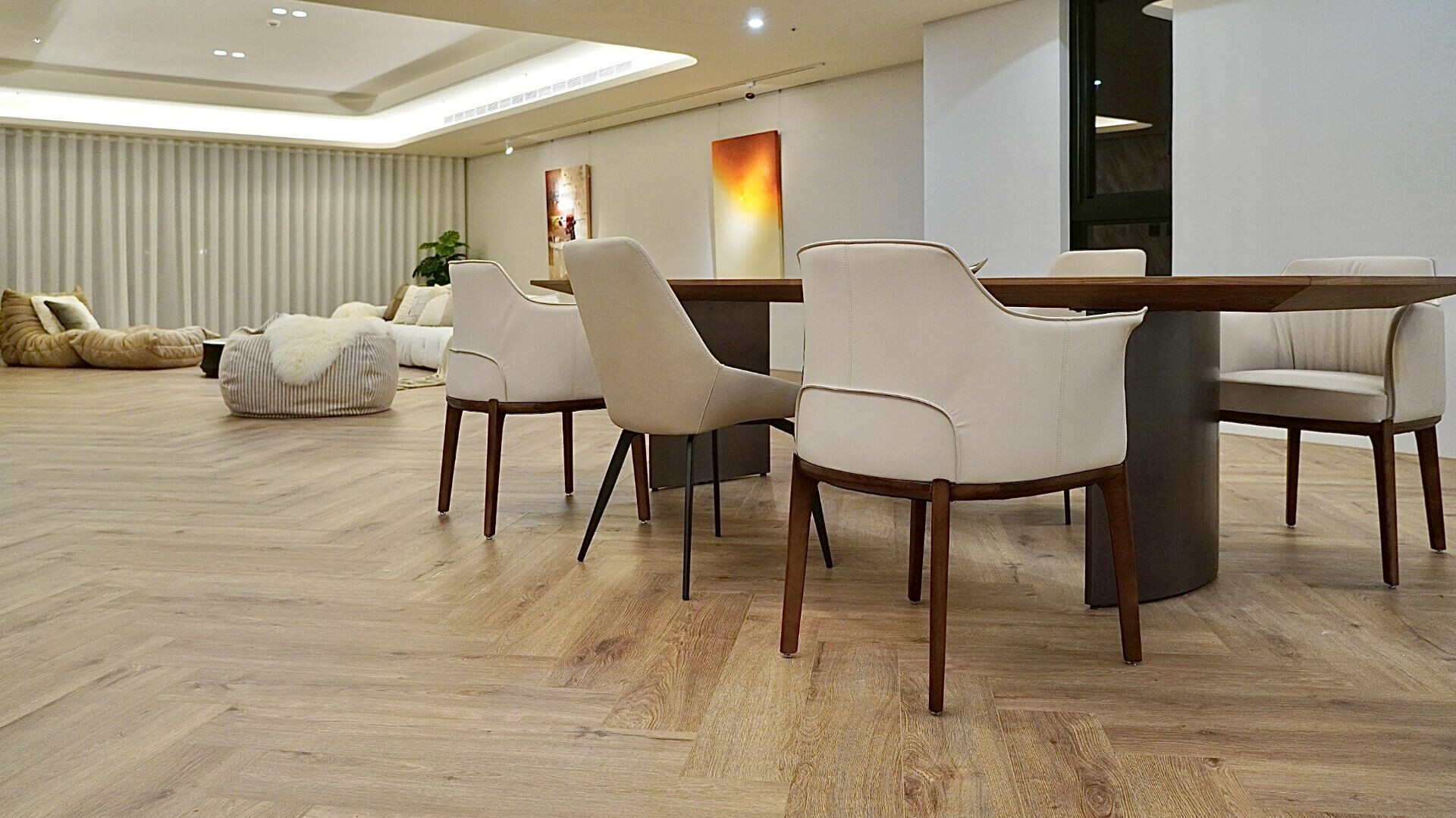 設計師將德國 Meister 超耐磨木地板, LS350_7002 琥珀色人字拼橡木地板應用於客廳與廚房公共空間。840 × 168 mm 的大尺寸人字拼比例,特別適合開放式大坪數格局,讓空間在理性機能之上,多了一層低調而細膩的節奏感。這是一款從材料本質、製程到使用階段,皆以居住者健康為核心的地坪選擇。從空氣到建材,健康是最低標準,不是加分題。