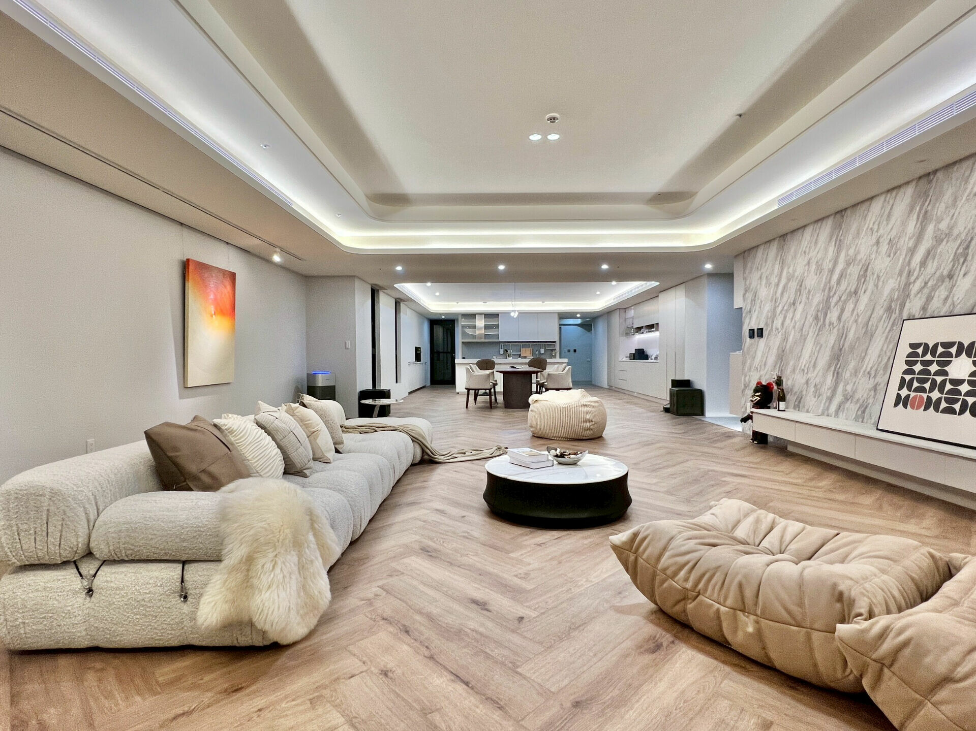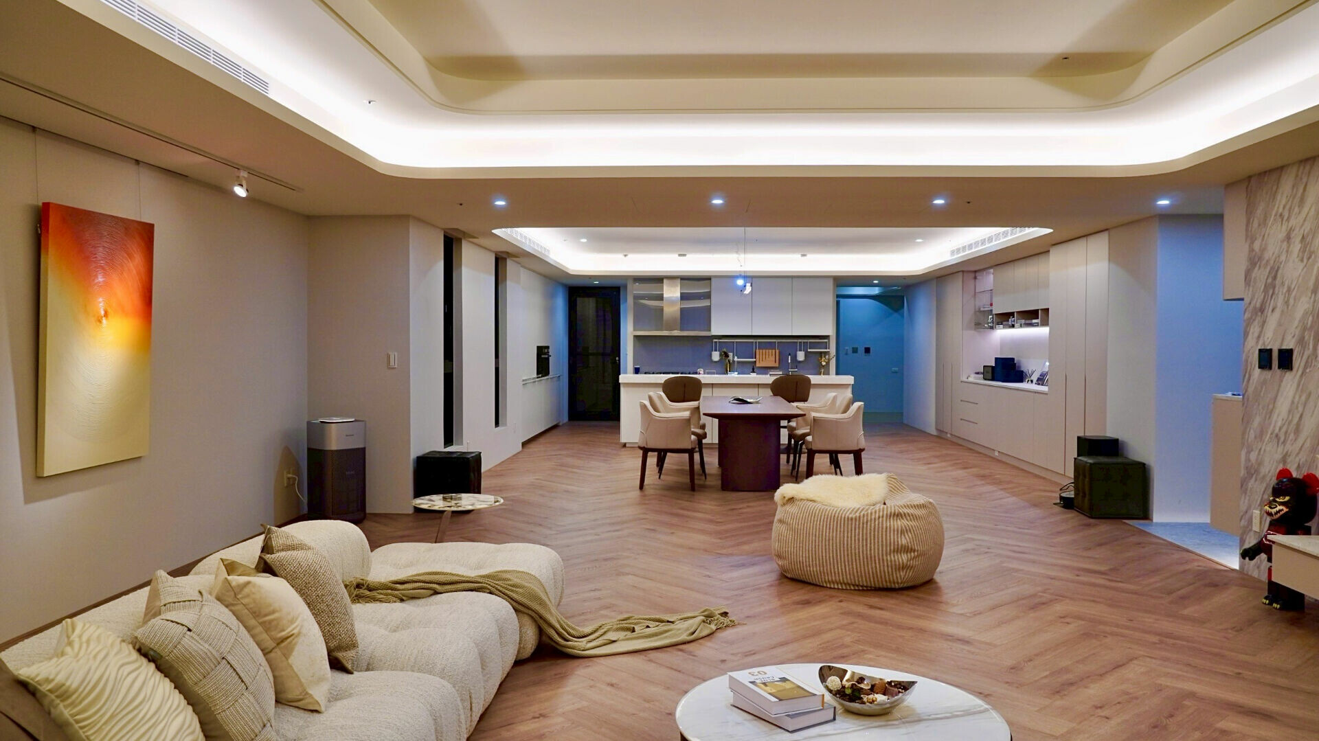 廚房和客廳是採開放式的空間,全室鋪設德國 Meister 大師超耐磨木地板。在這裡「豪宅」的定義,被重新校準為 : 一個長時間居住,也不會對身體造成負擔的好宅。