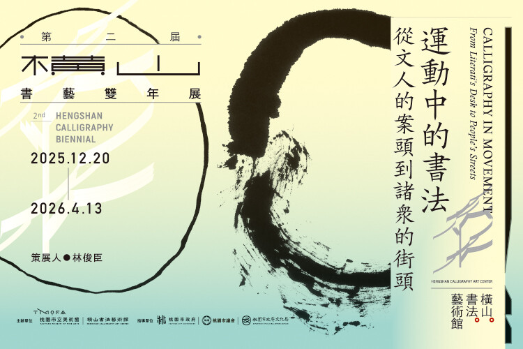 桃園市立美術館(以下簡稱桃美館)為推廣書法藝術的多元發展並拓展國際與當代間書法議題交流,於橫山書法藝術館(以下簡稱書藝館)特別策劃建立兩年一度的「橫山書藝雙年展」,期待透過雙年展保有書法於當代藝術發展中的批判性。本次第二屆「2025橫山書藝雙年展:運動中的書法——從文人的案頭到諸眾的街頭」,由國立臺南大學林俊臣教授擔任策展人,並邀請龔卓軍、小原俊樹、谷川雅夫擔任策展顧問,透過相互激盪與對話,重新建構書法的多重思考面貌。展覽自2025年12月20日(六)至2026年4月13日(一)於橫山書法藝術館展出。
