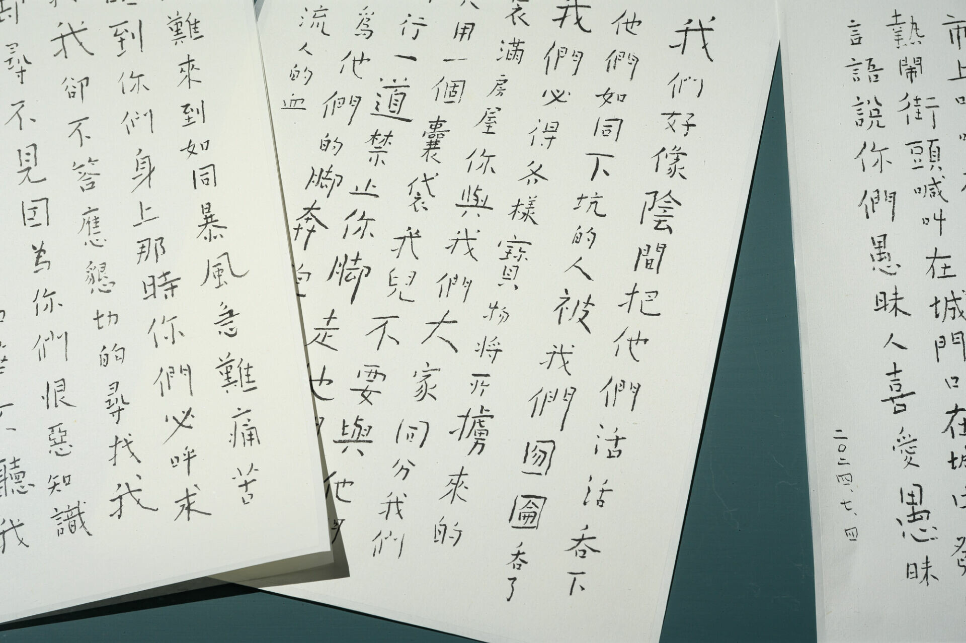 本展同時參照日本書法的發展脈絡。自鎌倉時代(1185-1333)後,僧人與畫家以真率自由的筆墨開展出非正統的書風。二戰之後,前衛書家更從中汲取靈感,證明創新未必源自形式突破,而來自對「人」與真實書寫狀態的重新發現。該精神亦在施俊吉的〈參陸伍.寫聖經日常〉中得以窺見,他每天抄寫一段聖經,一年累積365張,讓書寫從技藝變成冥想與祈禱,成為現代生活中難得的安靜時刻。