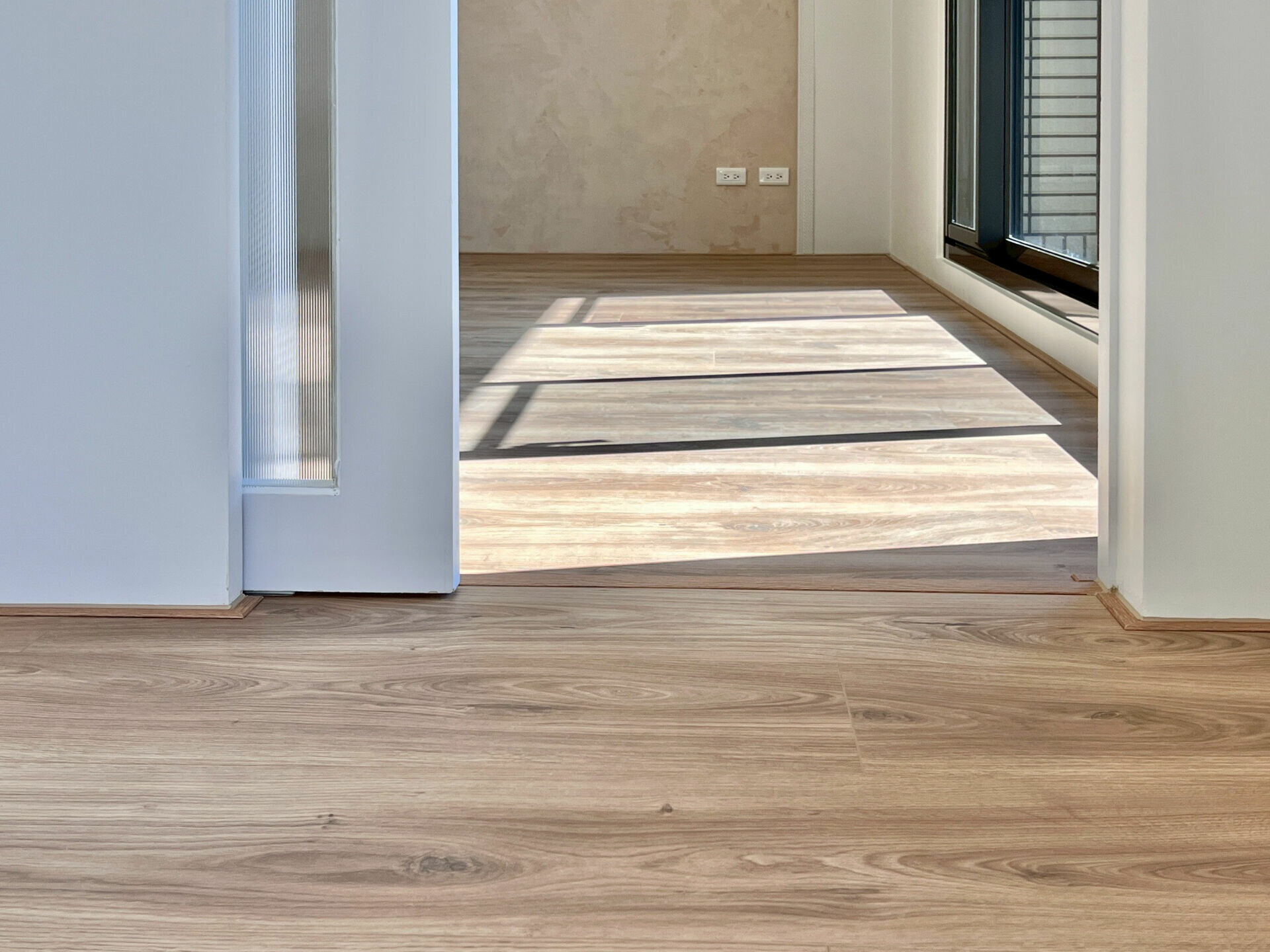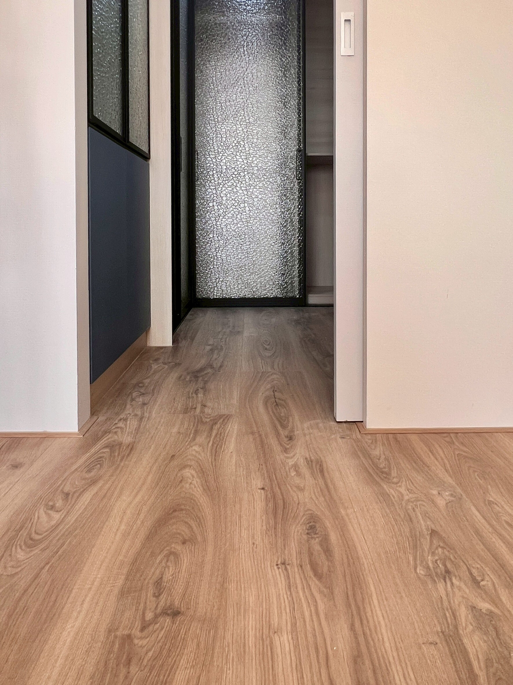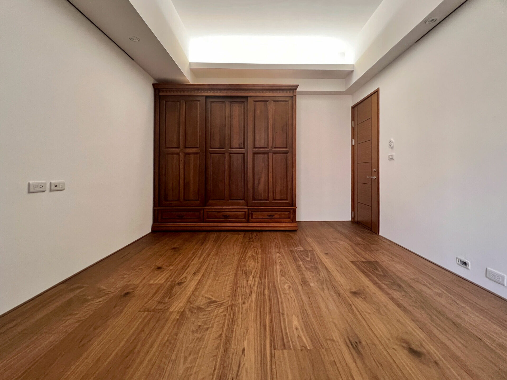 長輩的套房,保留了他們熟悉且喜愛的實木衣櫥。地坪則改以 Meister Lindura 超硬度實木複合地板——HD400-8523 美國胡桃木,27cm 寬、220cm 長的大尺寸比例,搭配深色木紋,呈現沉穩內斂的生活氣質,也讓整體空間質感自然提升。