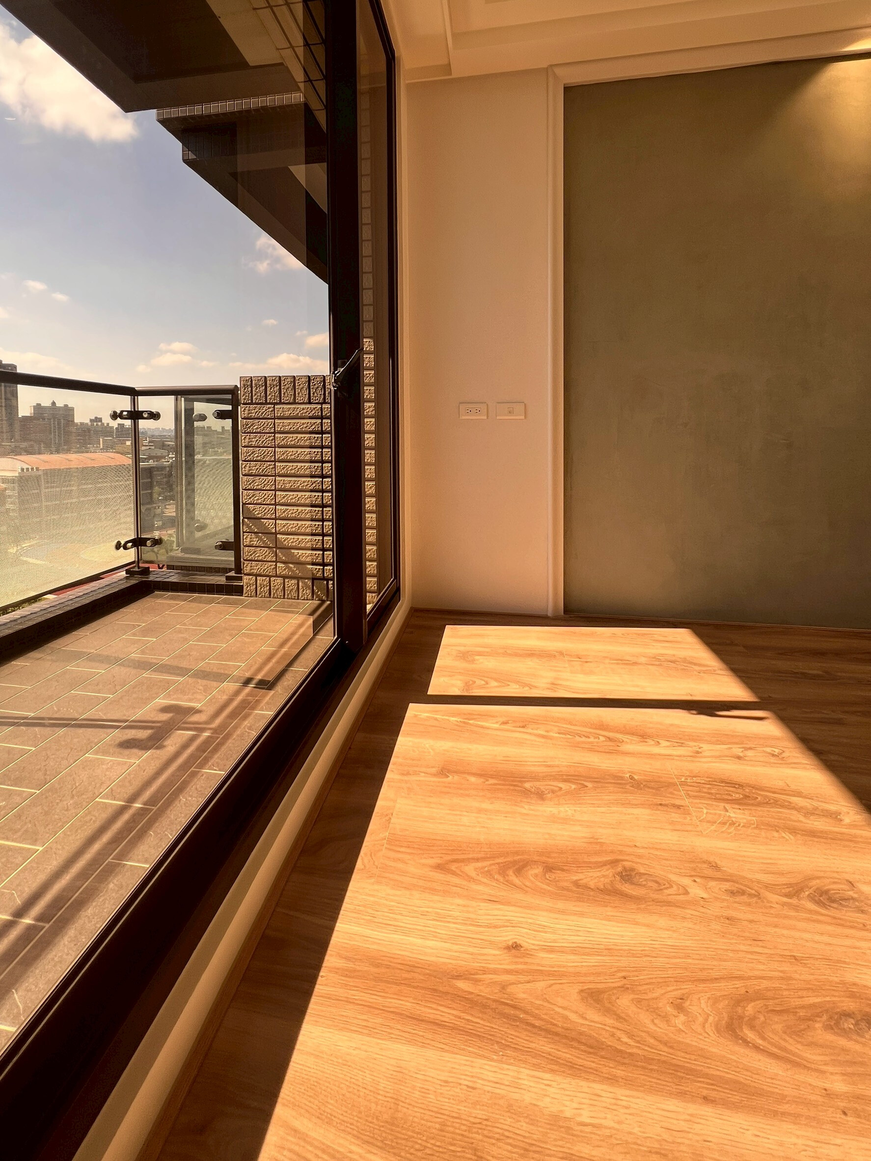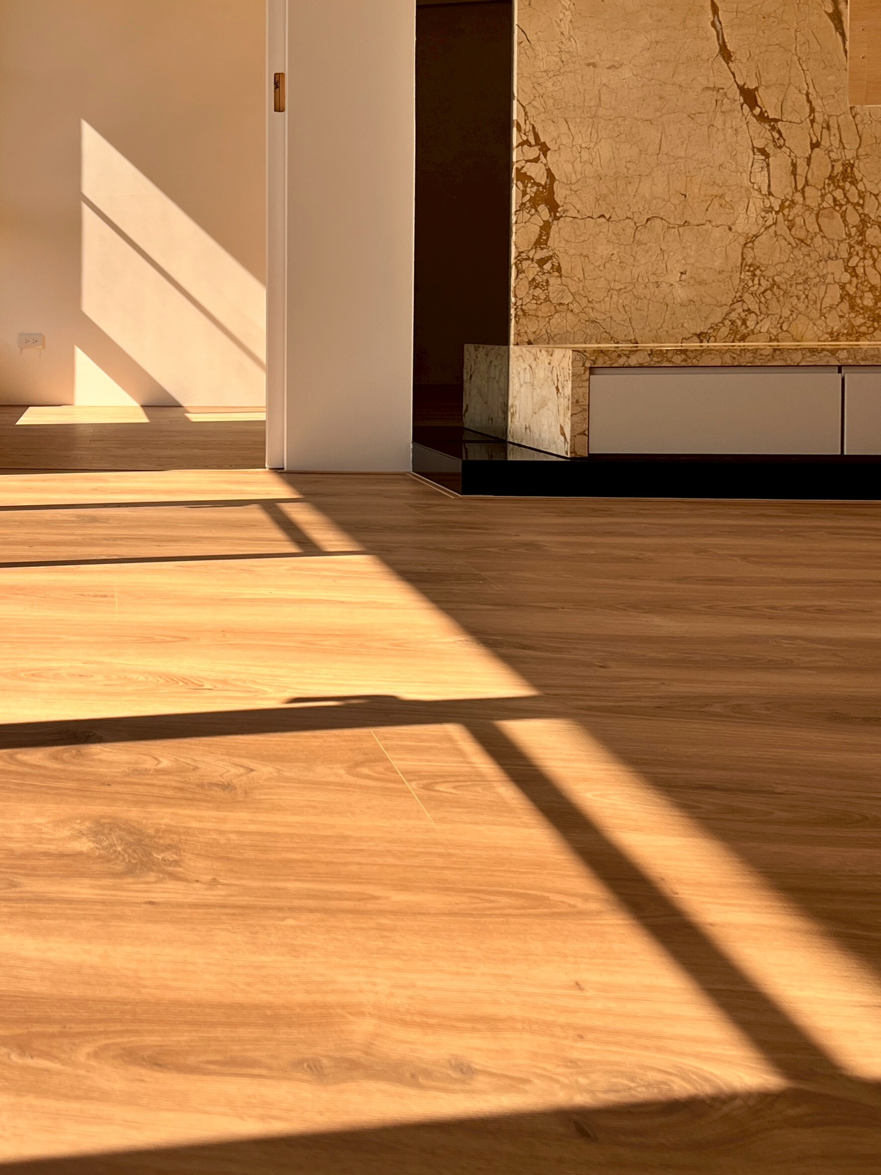 清晨時分,窗影灑落在地板上,隨時間變化呈現不同表情,讓空間自然流動著溫度。