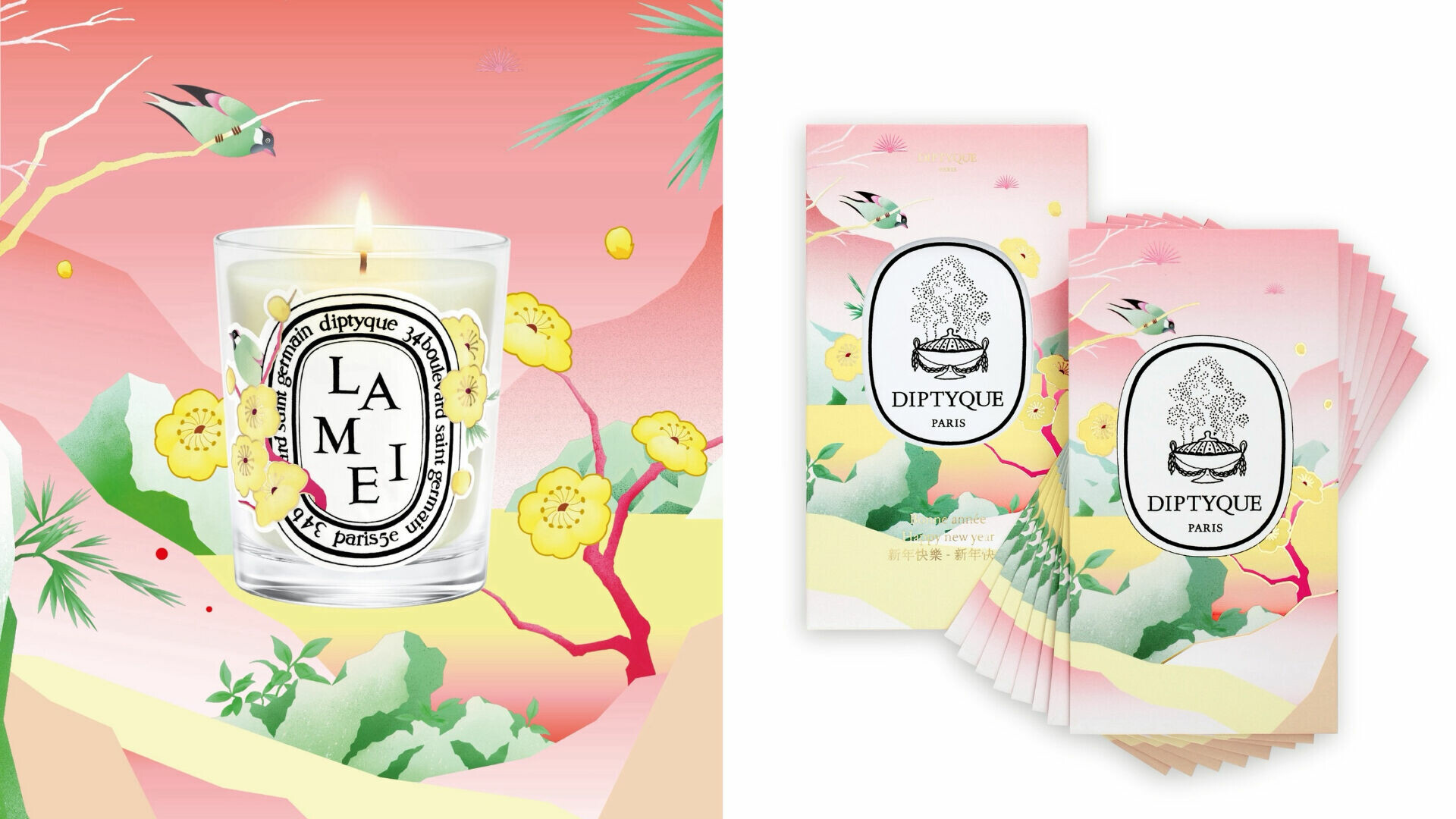 為慶祝農曆新年,Diptyque首度隆重推出以季節更迭與新生為靈感的全新春節限量香氛蠟燭——臘梅(Lamei)。藝術家林子楠特別為此創作一幅融合傳統與現代的當代風景,將充滿喜悅與詩意的畫面點綴於限量版蠟燭之上。臘梅與喜鵲相映成趣,象徵春回大地與繁榮昌盛的吉祥意象,為新年帶來滿溢希望與祝福的氛圍。