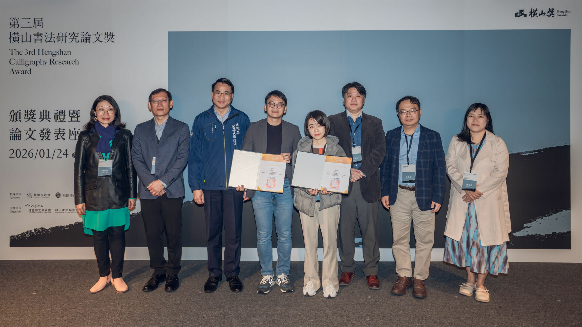 與會貴賓合影,左起提名人香港中文大學文物館研究員何碧琪、桃園市立美術館館長林詠能、桃園市政府文化局副局長唐連成、優選獎得主唐寧、橫山研究獎首獎得主簡欣晨、提名人國立故宮博物院書畫文獻處處長何炎泉、評審何創時書法藝術基金會董事兼主任研究員吳國豪、以及評審澳門大學藝術與設計系副教授吳秀華。
