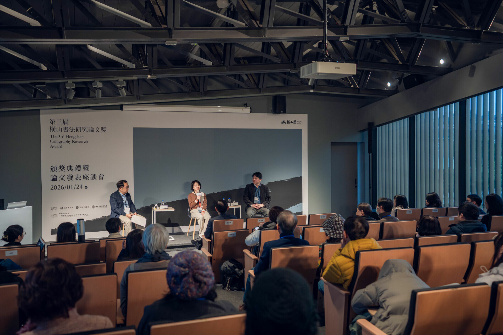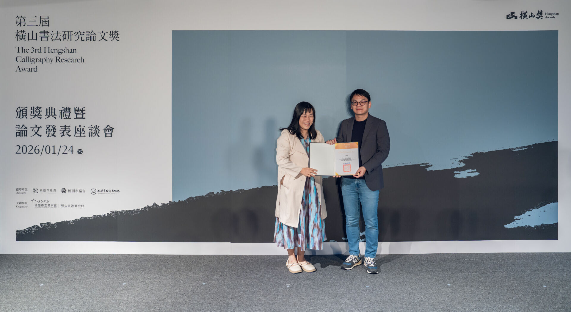 桃園市立美術館(以下簡稱桃美館)為持續培植與發掘書法藝術研究人才,並推動書法研究在在地與國際、傳統與創新、理論與實踐等多重面向的深化發展,由橫山書法藝術館(以下簡稱書藝館)主辦之「第三屆橫山書法研究論文獎」(以下簡稱論文獎),於2026年1月24日隆重舉行頒獎典禮暨獲獎論文發表座談會。本屆頒獎典禮邀請何創時書法藝術基金會董事兼主任研究員吳國豪代表國際評審團致詞,並特別播放中國浙江大學藝術與考古學院教授薛龍春之預錄評審致詞影片,由桃園市政府文化局副局長唐連成及國際評審團共同頒發各獎項,活動同時進行三場次獲獎論文發表座談會,邀集評審、提名人與獲獎者進行深入討論與交流,促進國際書法研究經驗與學術觀點之對話。所有得獎論文亦同步收錄於橫山獎官方網站,並出版電子論文集,透過數位化,展現文化推廣與實踐永續資源與環境友善理念,以擴大研究成果之學術交流與影響力。