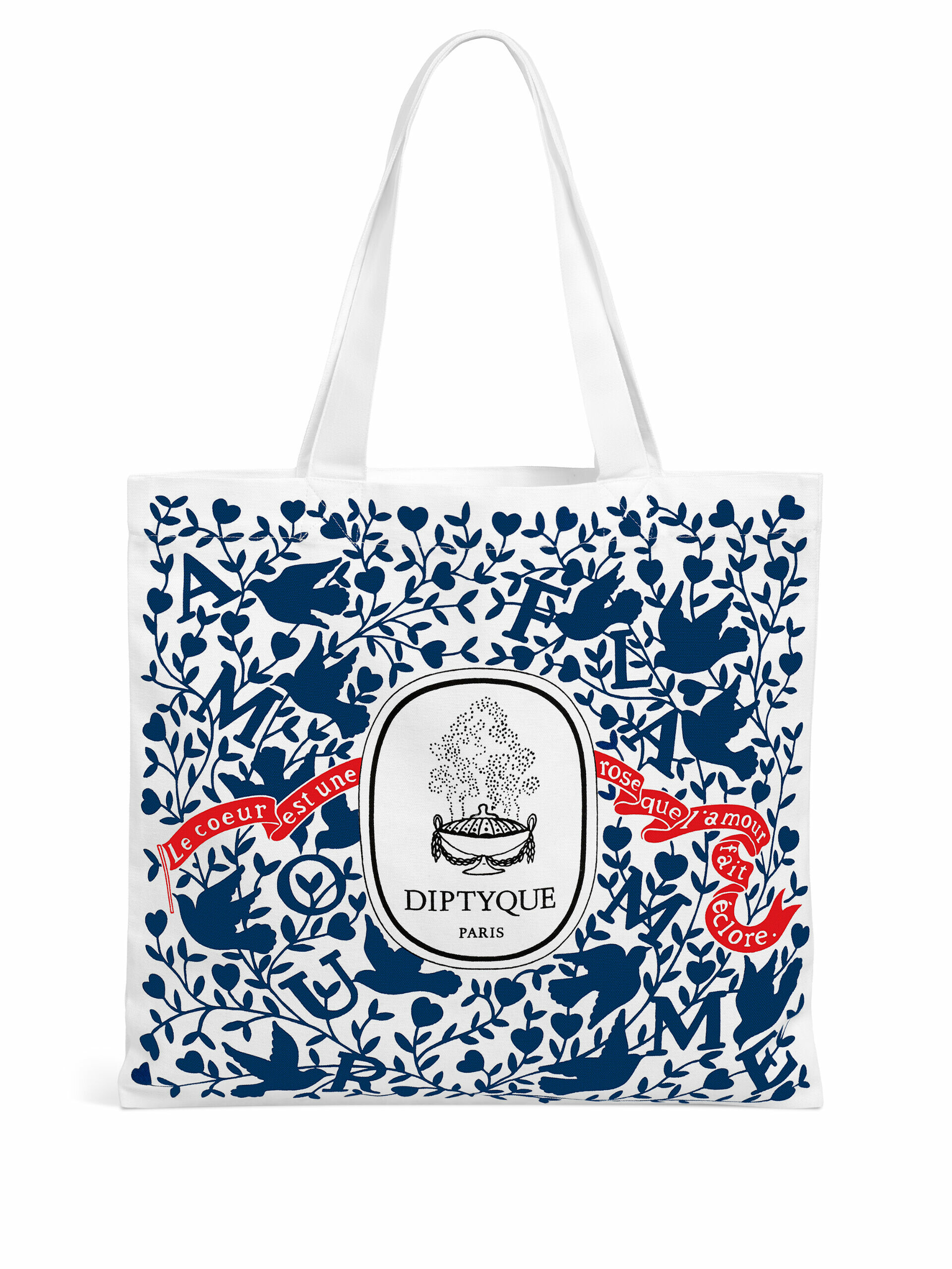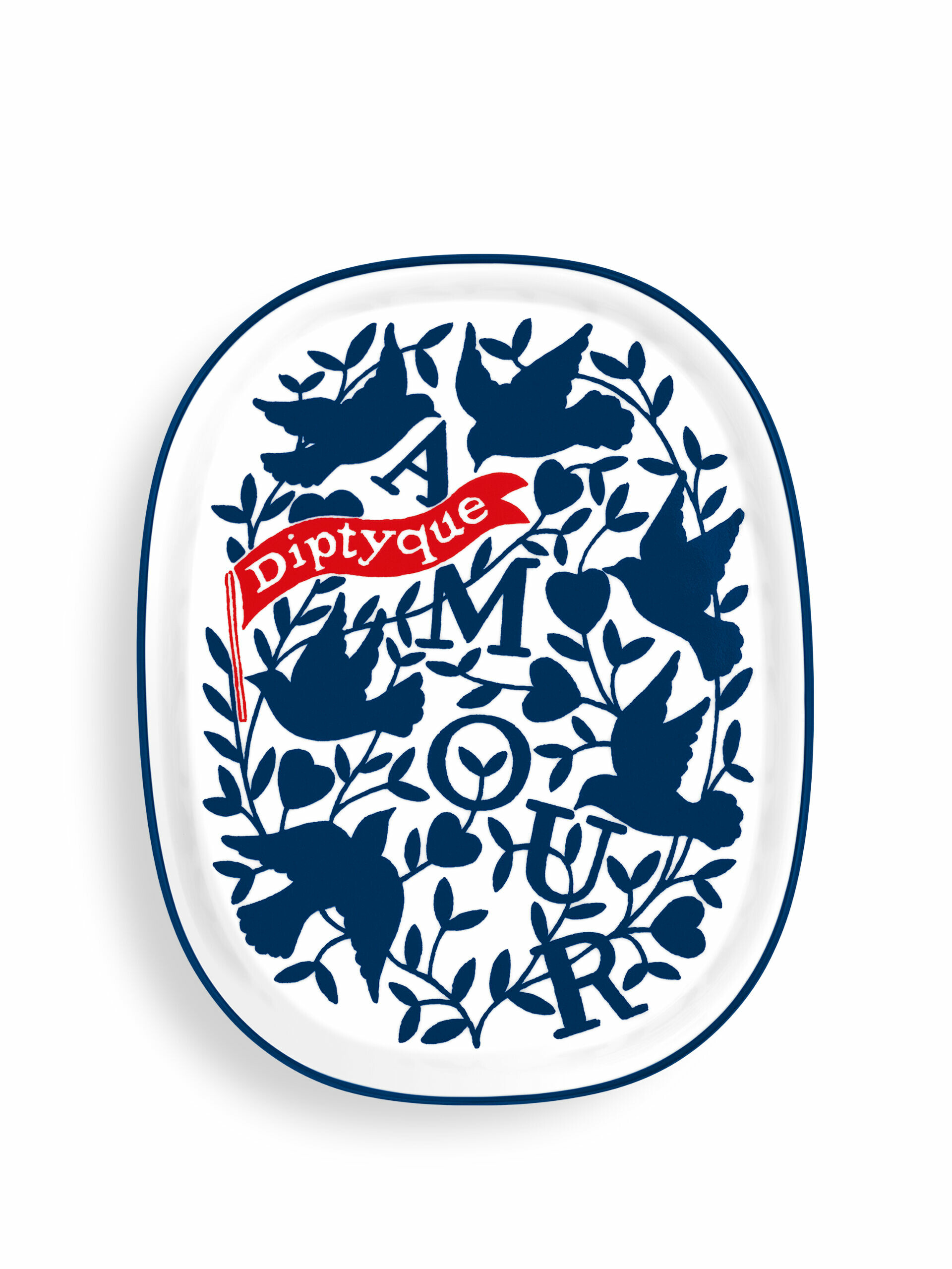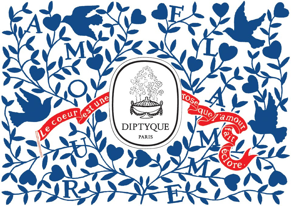 玫瑰香氛蠟燭的燭杯採用玻璃及陶瓷製成,以深藍色與紅色相互搭配的精美圖案點綴,突顯愛情的各式象徵元素:展翅飛翔的燕子、開滿心形花朵的樹枝,還有Diptyque經典橢圓內的「Amour」及「Flamme」躍動字母。