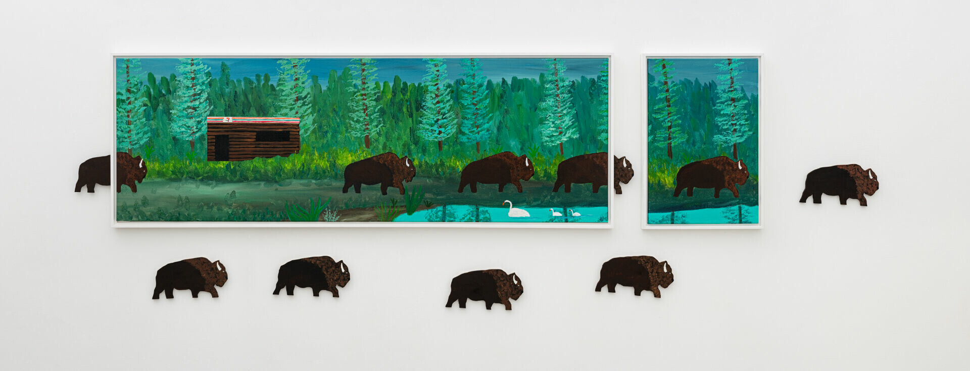 作品呈現了地理上的部分真實——加拿大廣袤的雪地、森林、湖泊、玉米田,野牛、天鵝、馬、人物、家寵則共享著同一片宏偉的棲息地。然而,埃瑟林頓透過扁平的構圖與鮮豔的壓克力顏料,抹去了野性的威脅與緊張,讓這些生物看起來像是在集體進行一場自得其樂的冒險,體現了他所謂的「熟悉與意外的交織」。