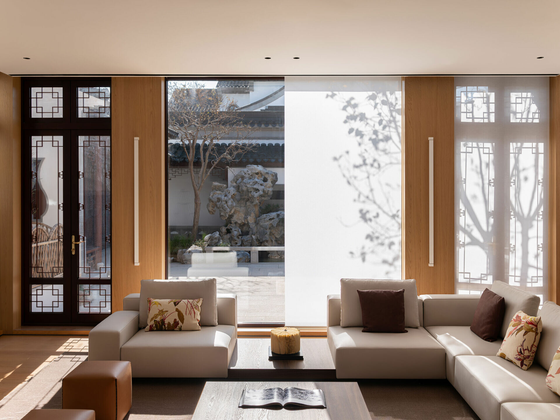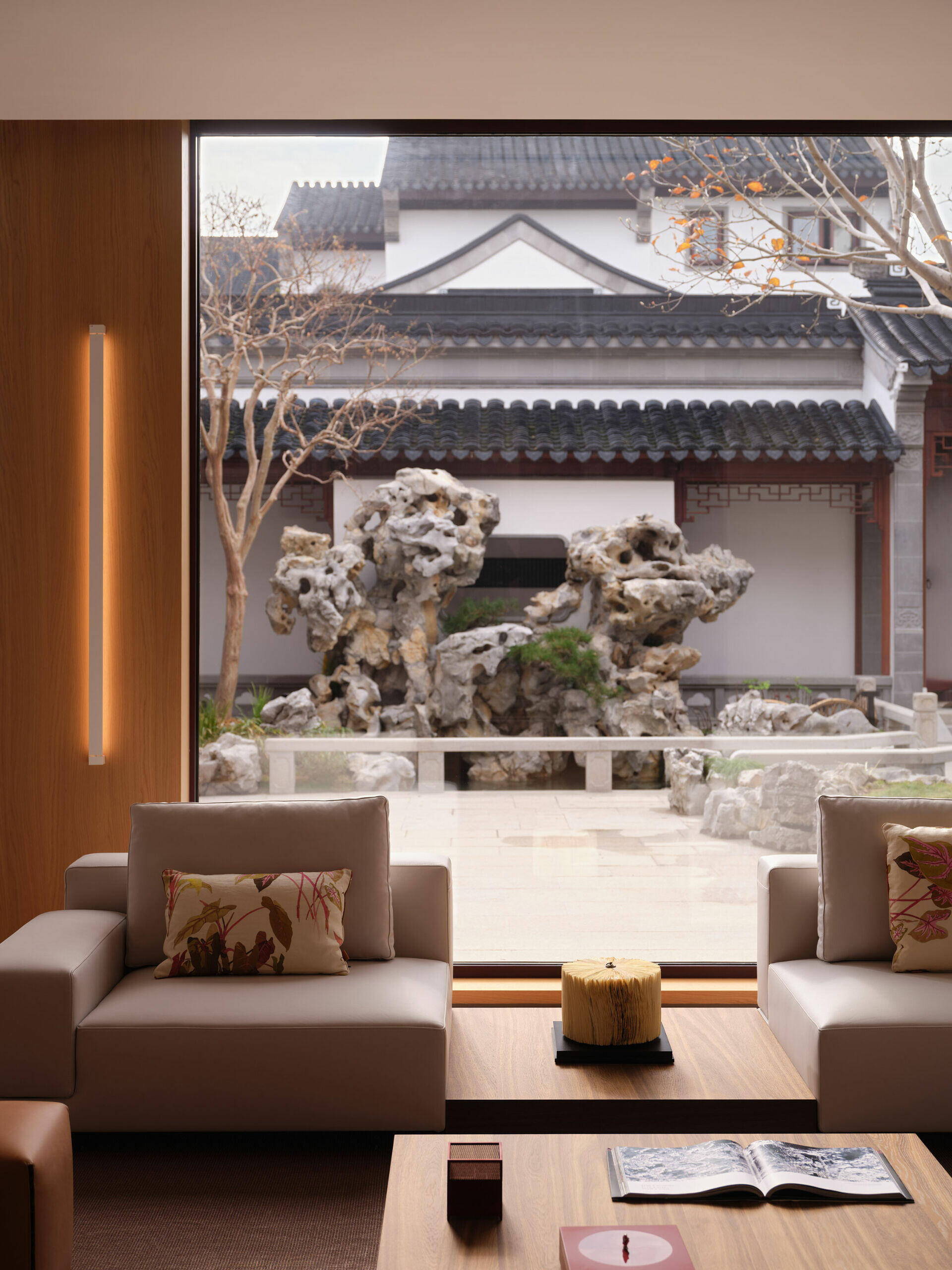公共空間刻意放大開口尺度,整面落地窗將庭院假山、太湖石與竹影引入室內。設計並未刻意強調景觀,而是透過視線高度、家具尺度與光影流動,讓自然成為空間的一部分。