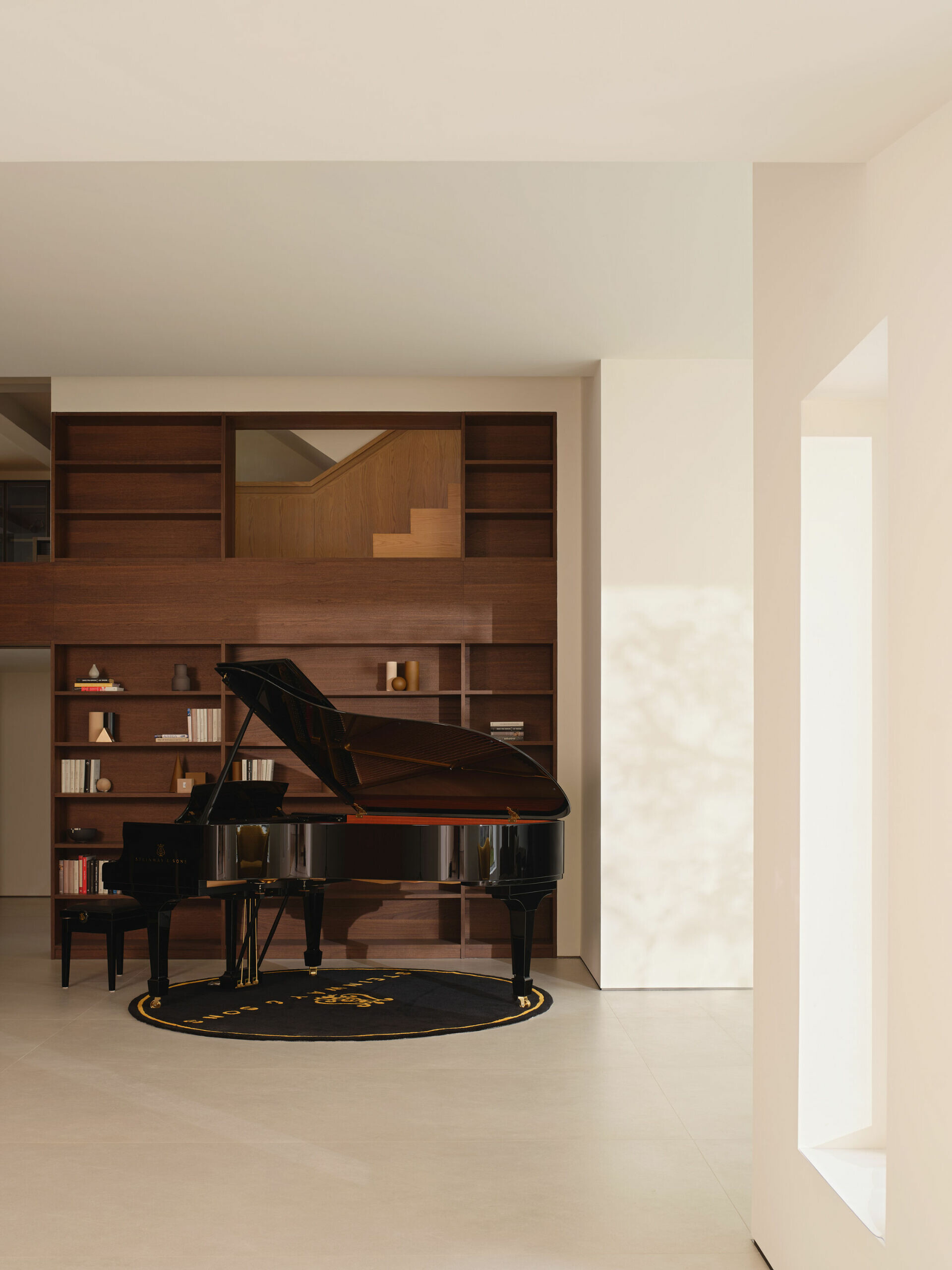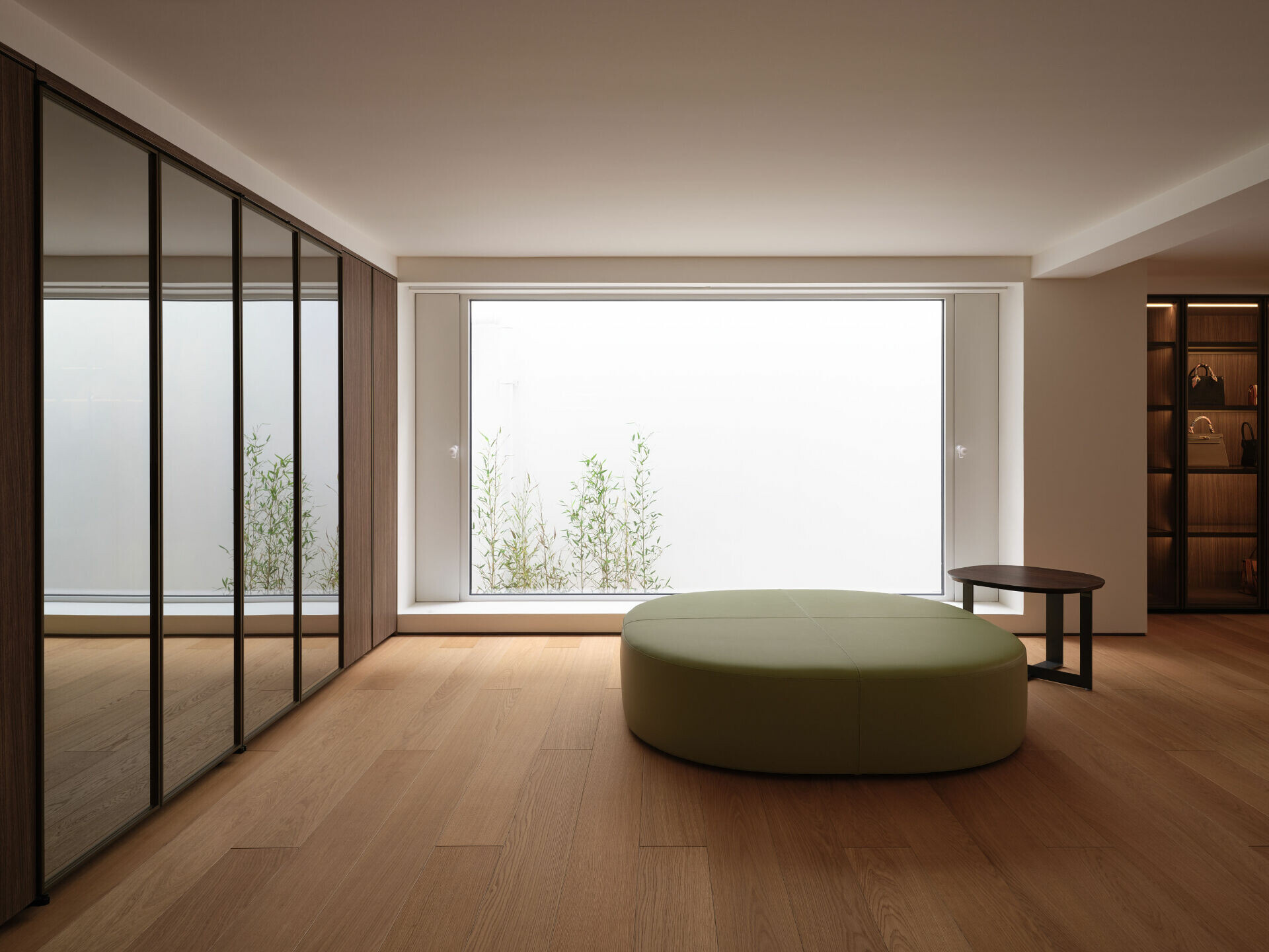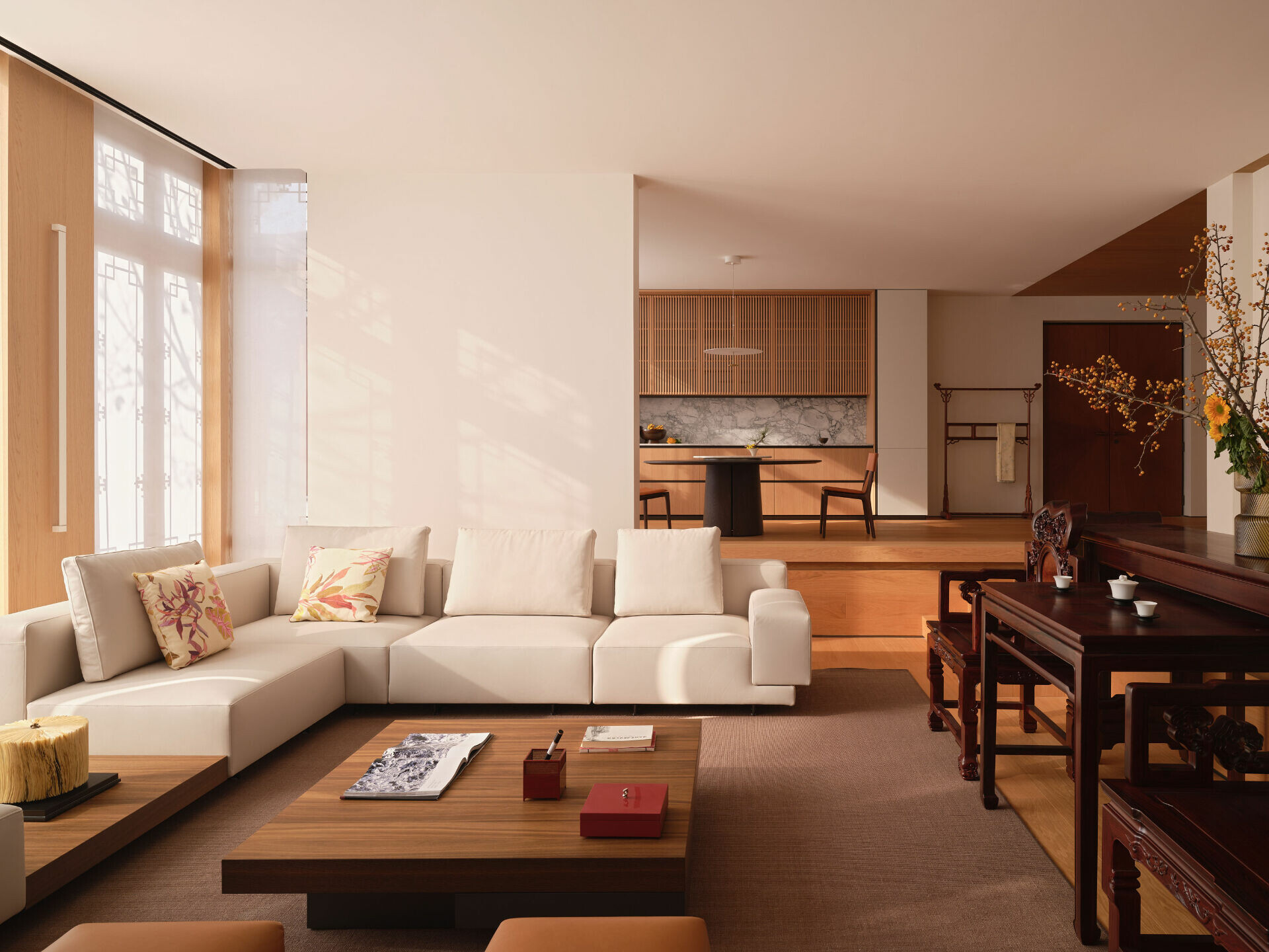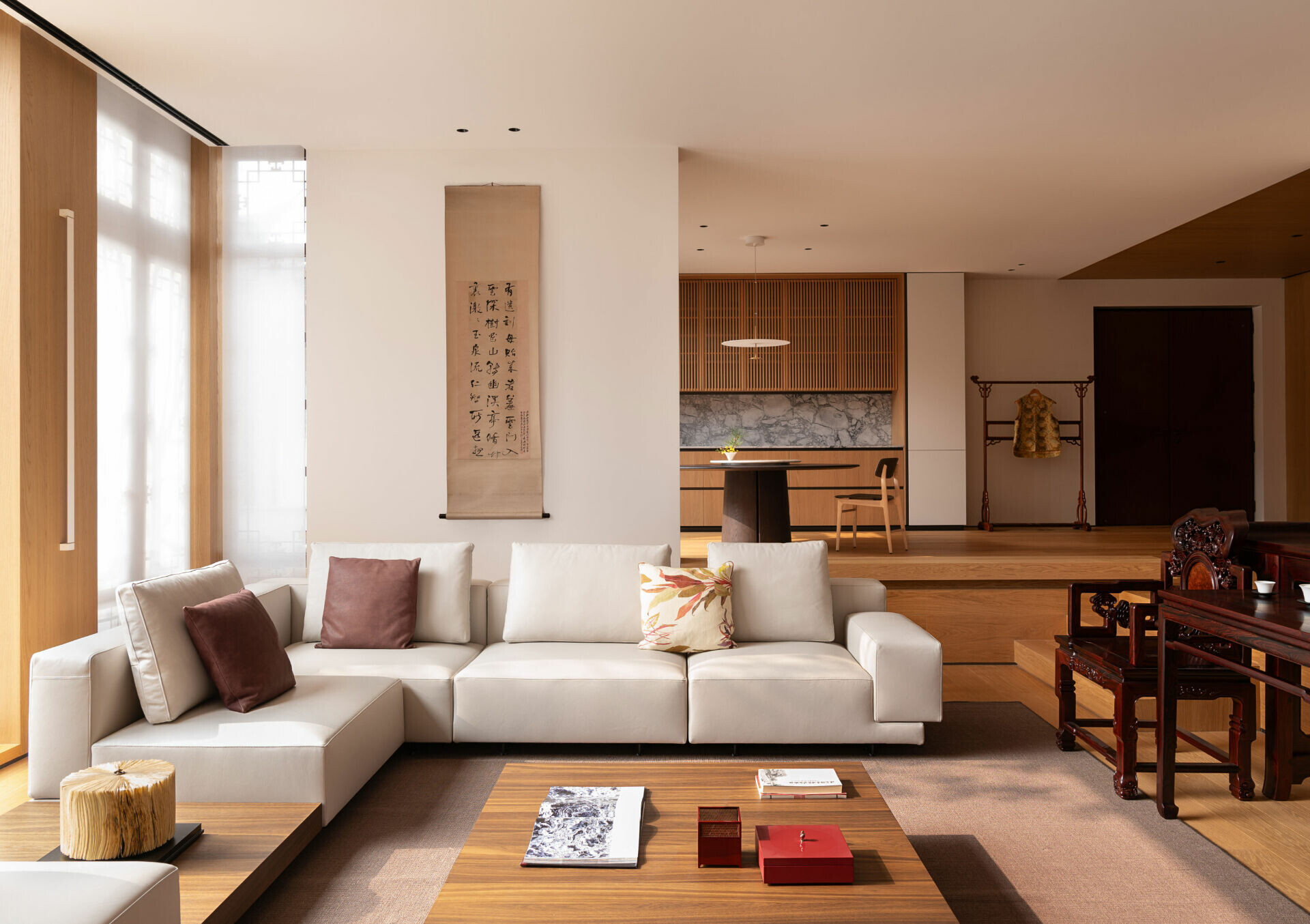 下沉式客廳降低視覺重心,使居住者更貼近庭院尺度。Molteni&C 沙發正對一件明式條案,形成東西方家具的靜默對話。牆面竹編屏風轉化光線為柔和的幾何圖騰,灰白基調則讓材質與景觀成為主角。