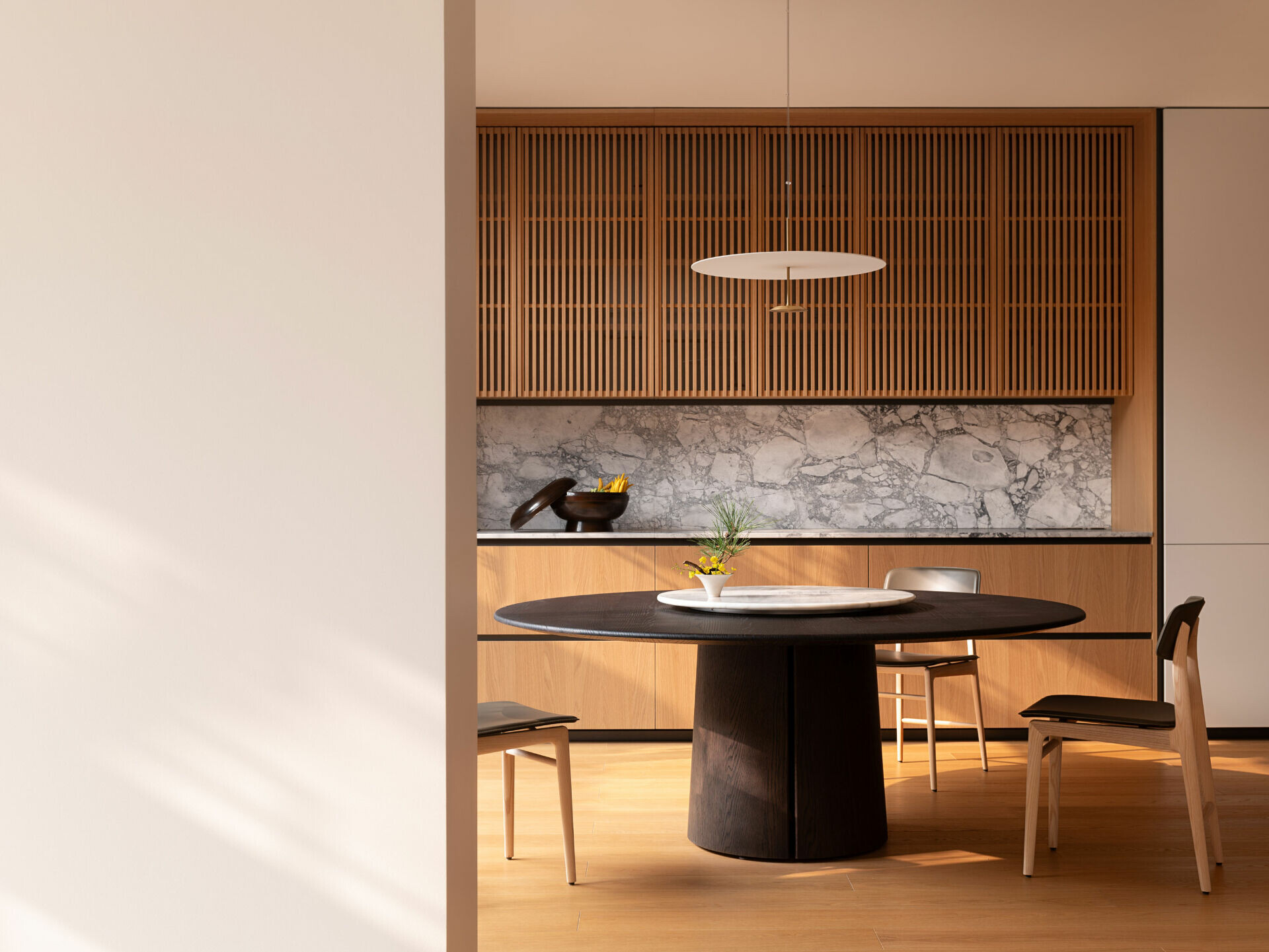 餐廳以圓桌為核心,搭配 Molteni&C 系統櫃體,透過格柵鐵件、霧面玻璃與長虹玻璃,創造輕盈而具層次的空間界定。實木地坪採不規則拼貼,光影隨時間移動,回應園林中的自然節奏。
