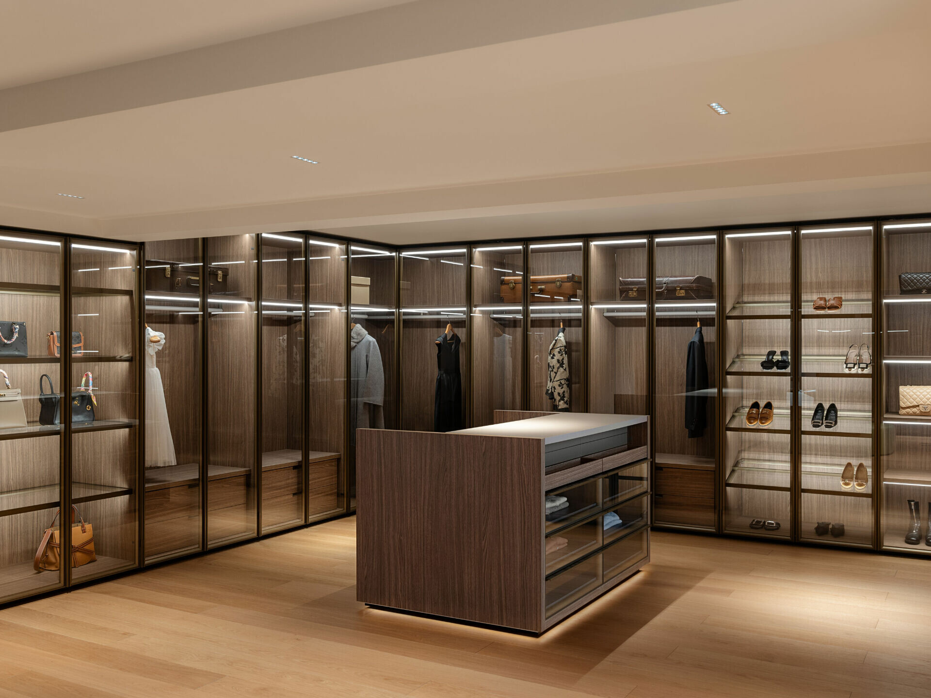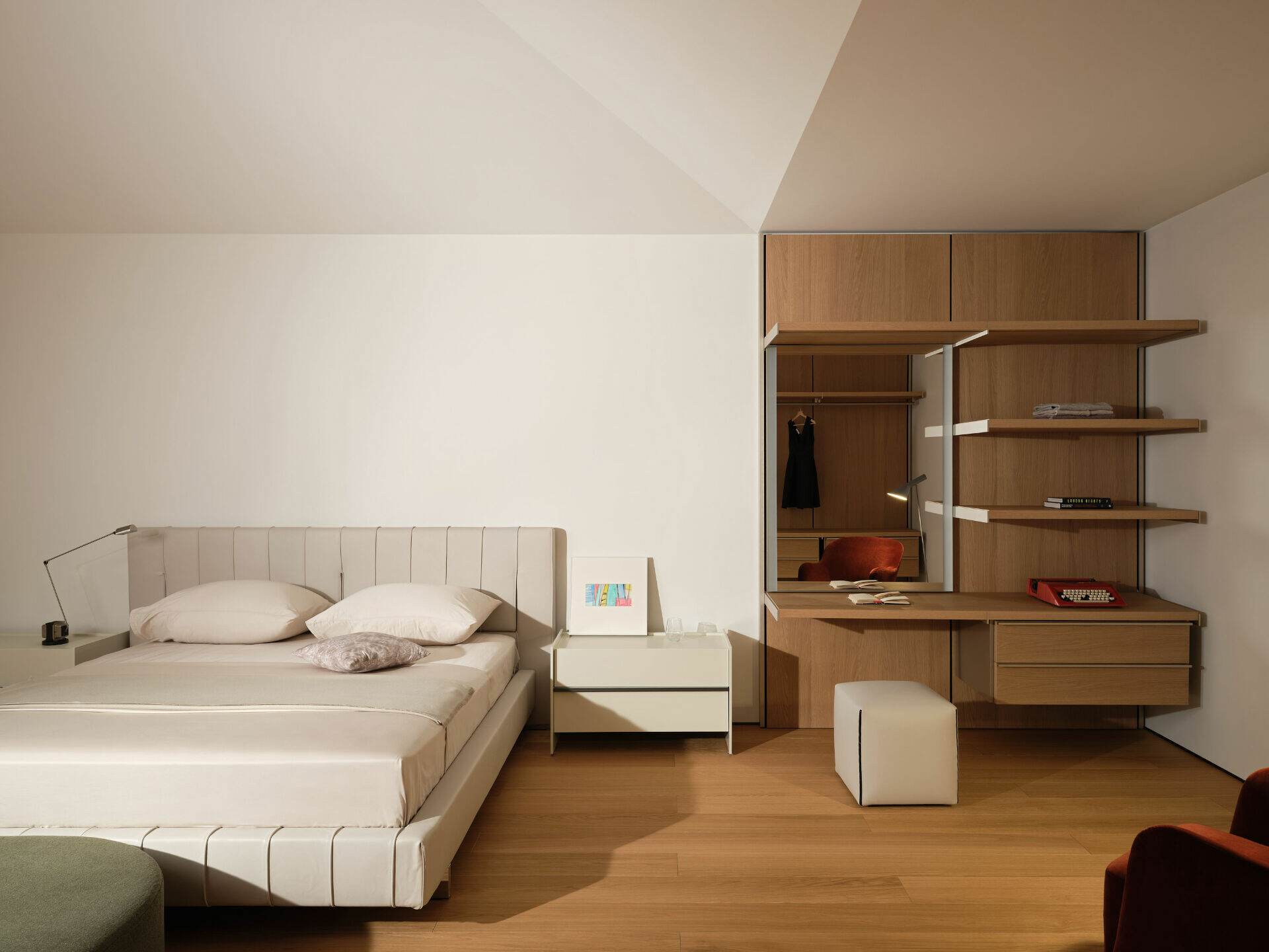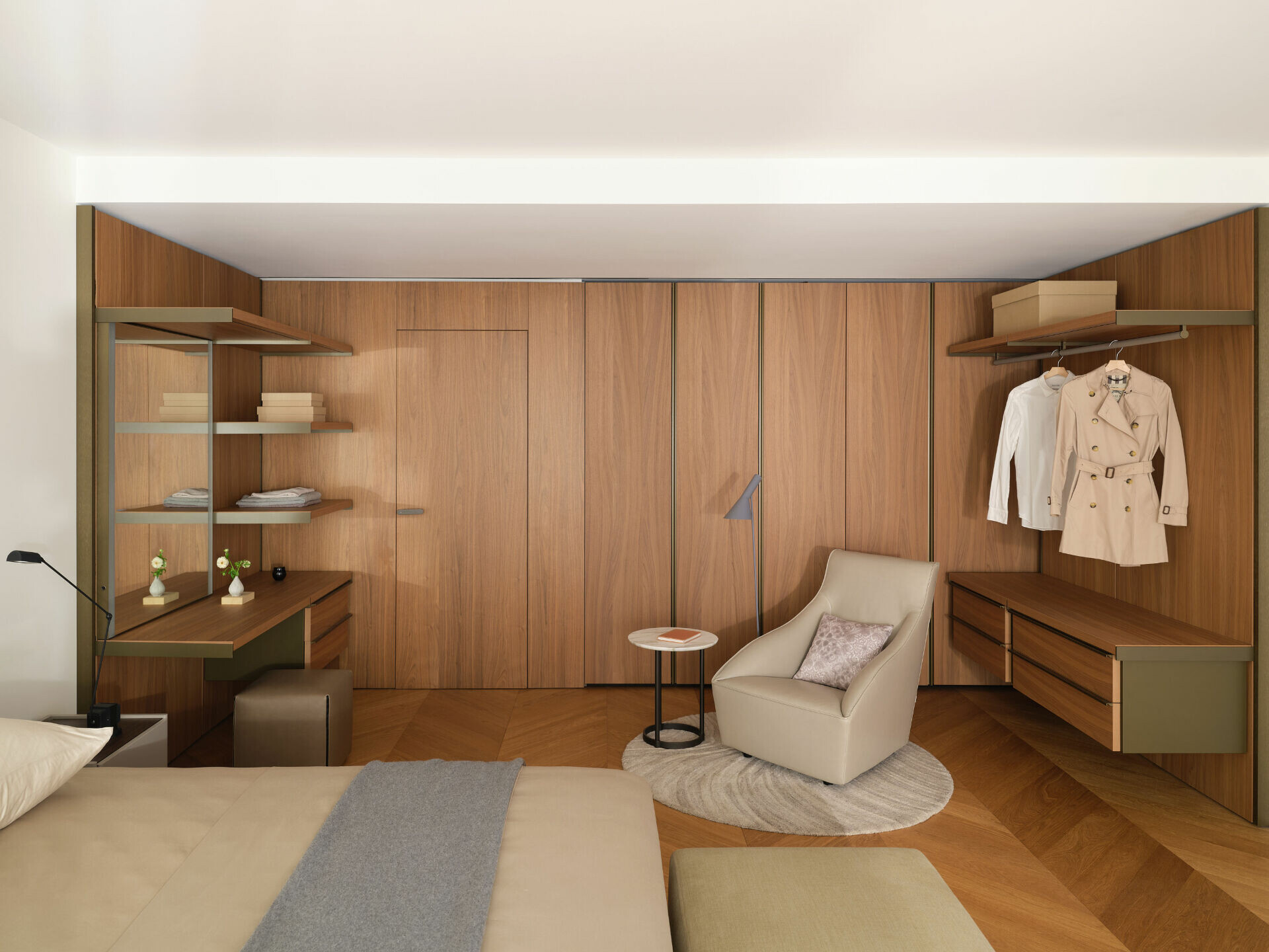 收納系統以毫米級精度嵌入牆體,抽屜阻尼、青銅五金與織品觸感,讓理性機能轉化為可被感知的生活細節。