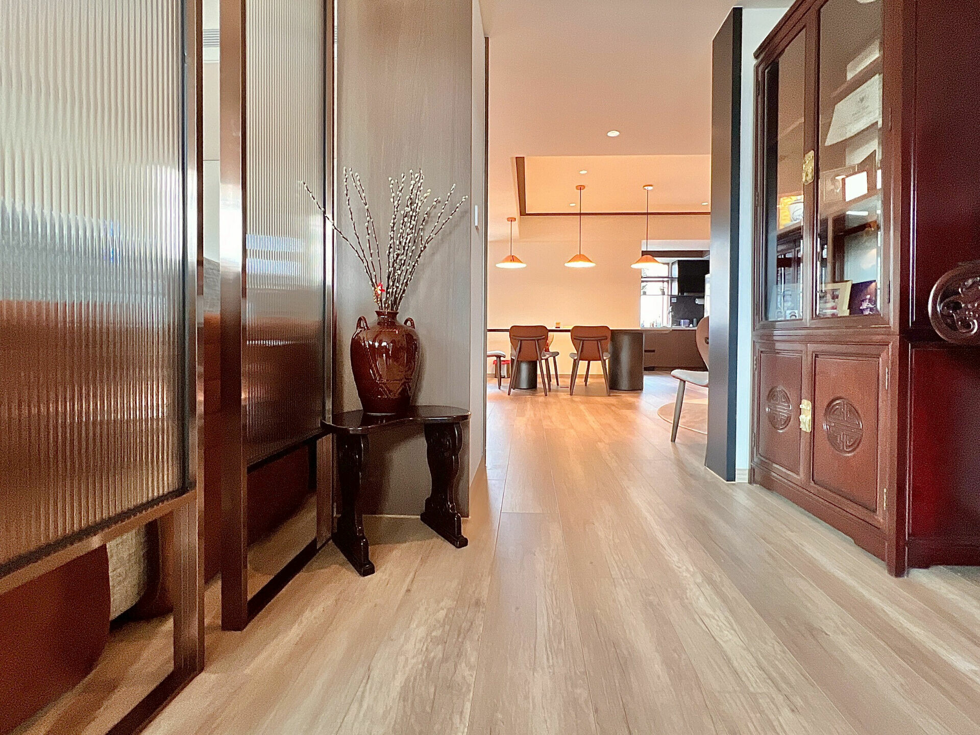 通往客餐廳之間的過道,以玻璃材質的現代中國風屏風作為界定,讓光線得以穿透,使空間顯得明亮而寬闊