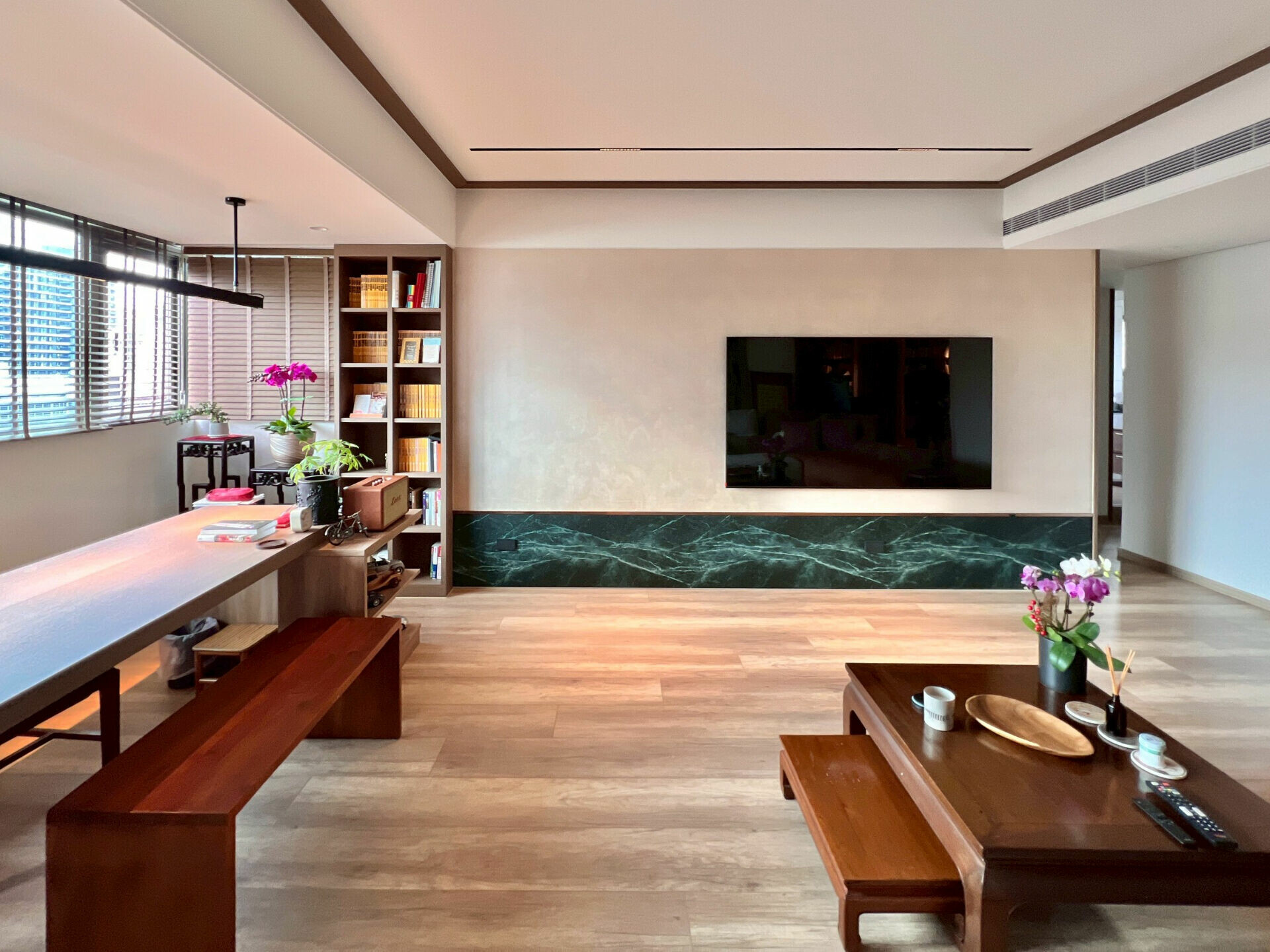 公共空間以客廳作為核心,設計師刻意採用低矮比例的沙發與茶几,重新設定視線高度,使空間在視覺上顯得更加寬闊,也讓人一坐下來就能感受到放鬆與安定。電視牆以部分深色墨綠色石材作為視覺焦點,沉穩地落在留白牆面之中,為空間建立安靜而穩定的背景。
