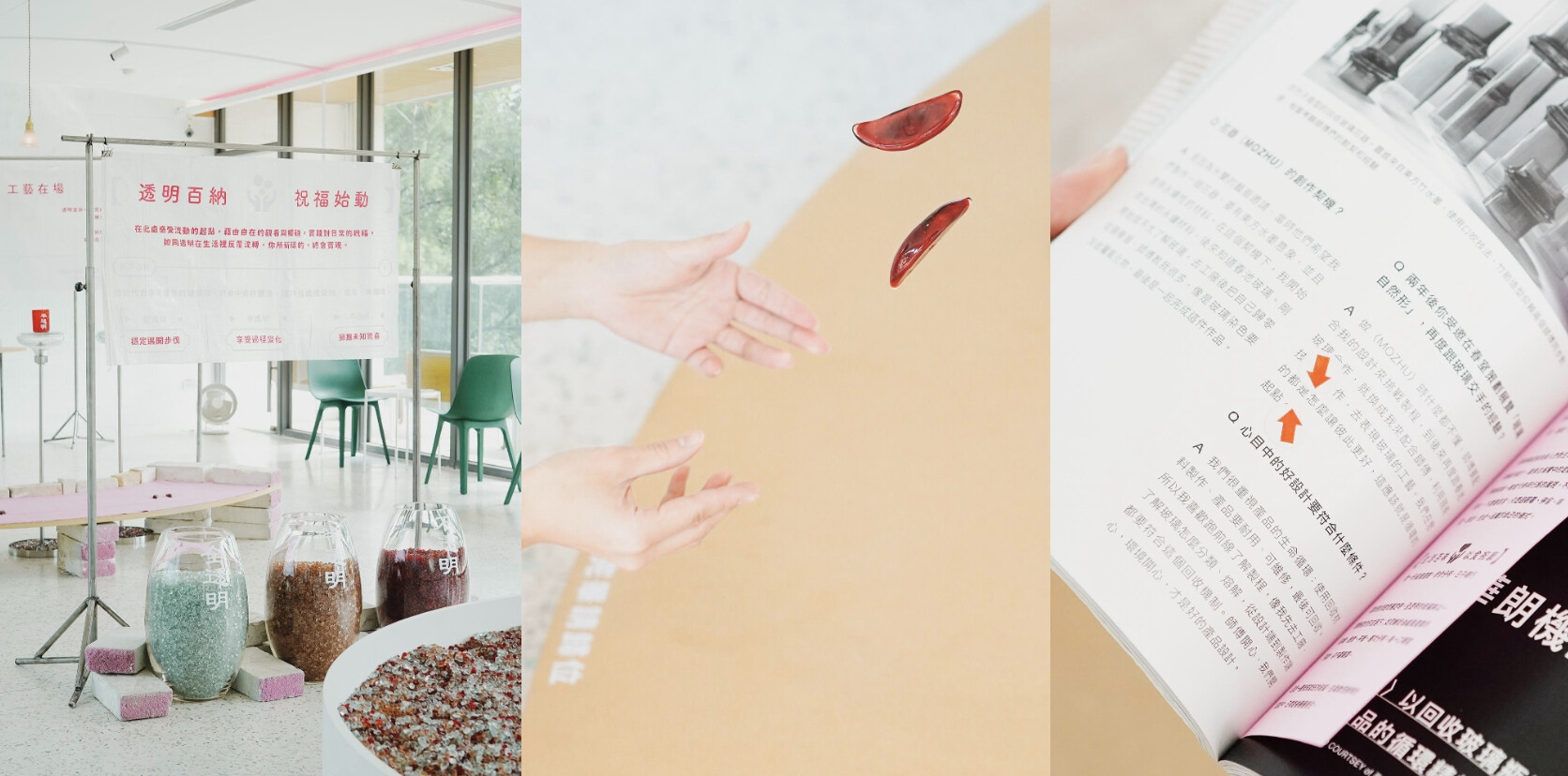廟宇裡常見擲筊問事與抽籤的習俗也成為了概念的一環,向未知提問、向自身尋找答案的過程,也被延伸為「透明選書」的解籤線索。在「透明廟仔」中,特別打造了以回收玻璃製成的筊杯及詩籤筒,並精選三本與透明、日常與生活風格相關的書籍,邀請觀者在文字之間展開一場安靜而私密的自我對話、探索內在與可能性。