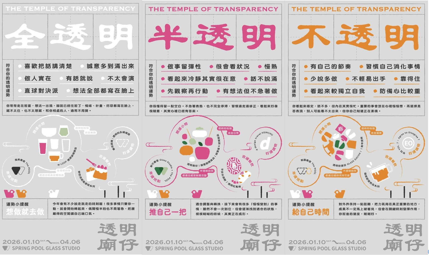 展覽也將核心語彙「透明」貫穿於祝福之中,並把來年的好運分為三種狀態,分別是象徵運勢穩定、按部就班的「全透明」;充滿驚喜與體驗的「不透明」;以及方向明確,卻享受未知過程的「半透明」。觀展者可從象徵香爐的玻璃桶中拾起一顆玻璃珠,投入場中央的許願池,以此選擇自己期盼的來年運勢,並為自身祈求好運。