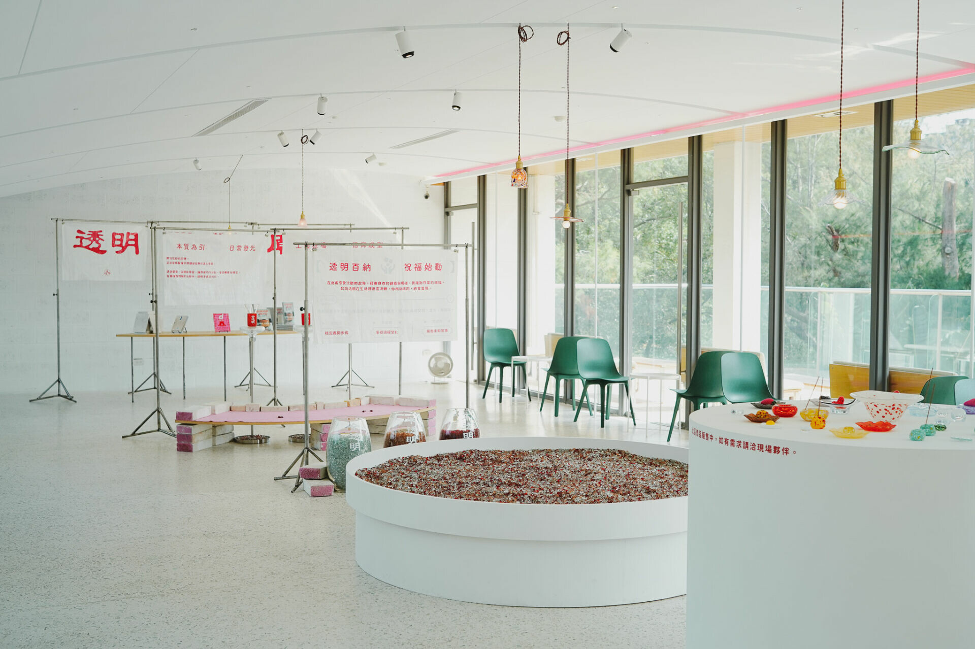 以「透明廟仔」作為命名,擷取常見的參拜儀式意象,如供桌、許願池、擲筊與詩籤,並與玻璃工藝結合後轉譯為觀展步驟。一踏入春室,首先映入眼簾的即是擺滿祭品的「透明供桌」,玻璃製成的水果、糖果、餅乾化身為永續的供品,而生活中常出現的線香與線香座,在此也象徵了大眾對於透明永續的實際參與。