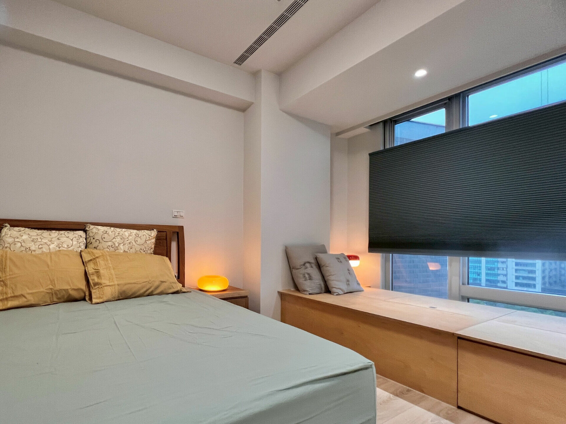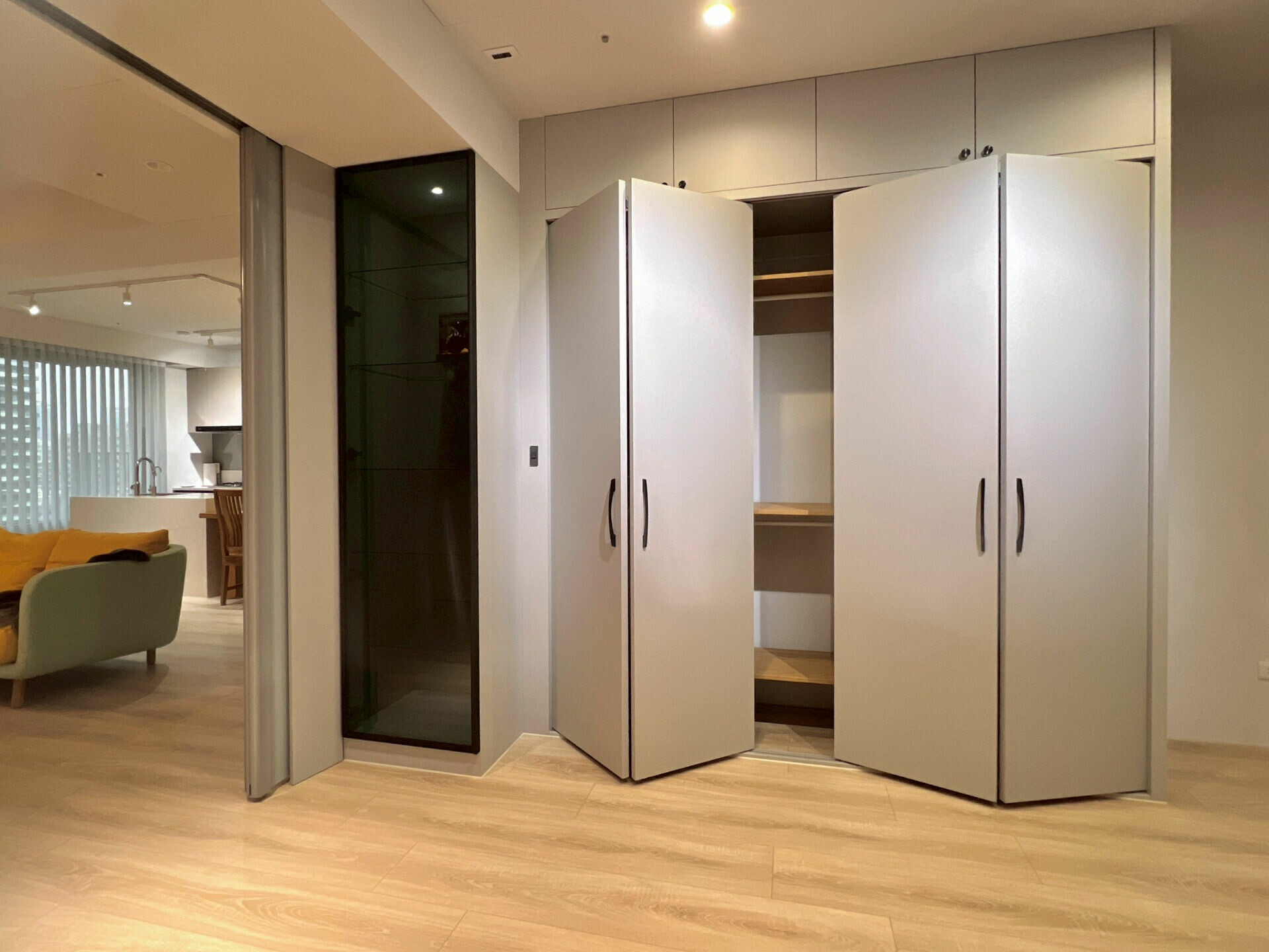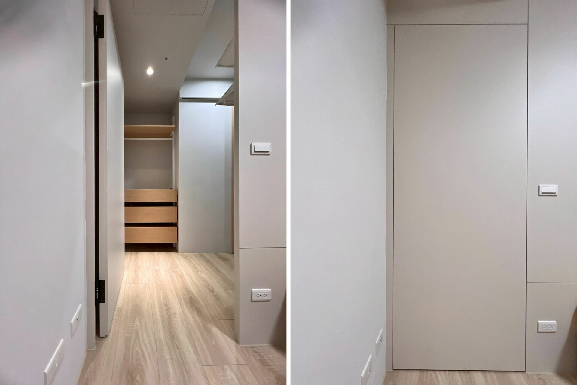 綾設計:我們尊重生活型態,而不是用傳統主臥思維去套。兩位屋主的作息不同,因此分房反而能提升生活品質。女主人希望有獨立更衣室,我們在櫃體系統與五金選擇上都以耐用、長期使用為優先,同時也在臥室天花配置隔音棉,確保真正的休息品質。