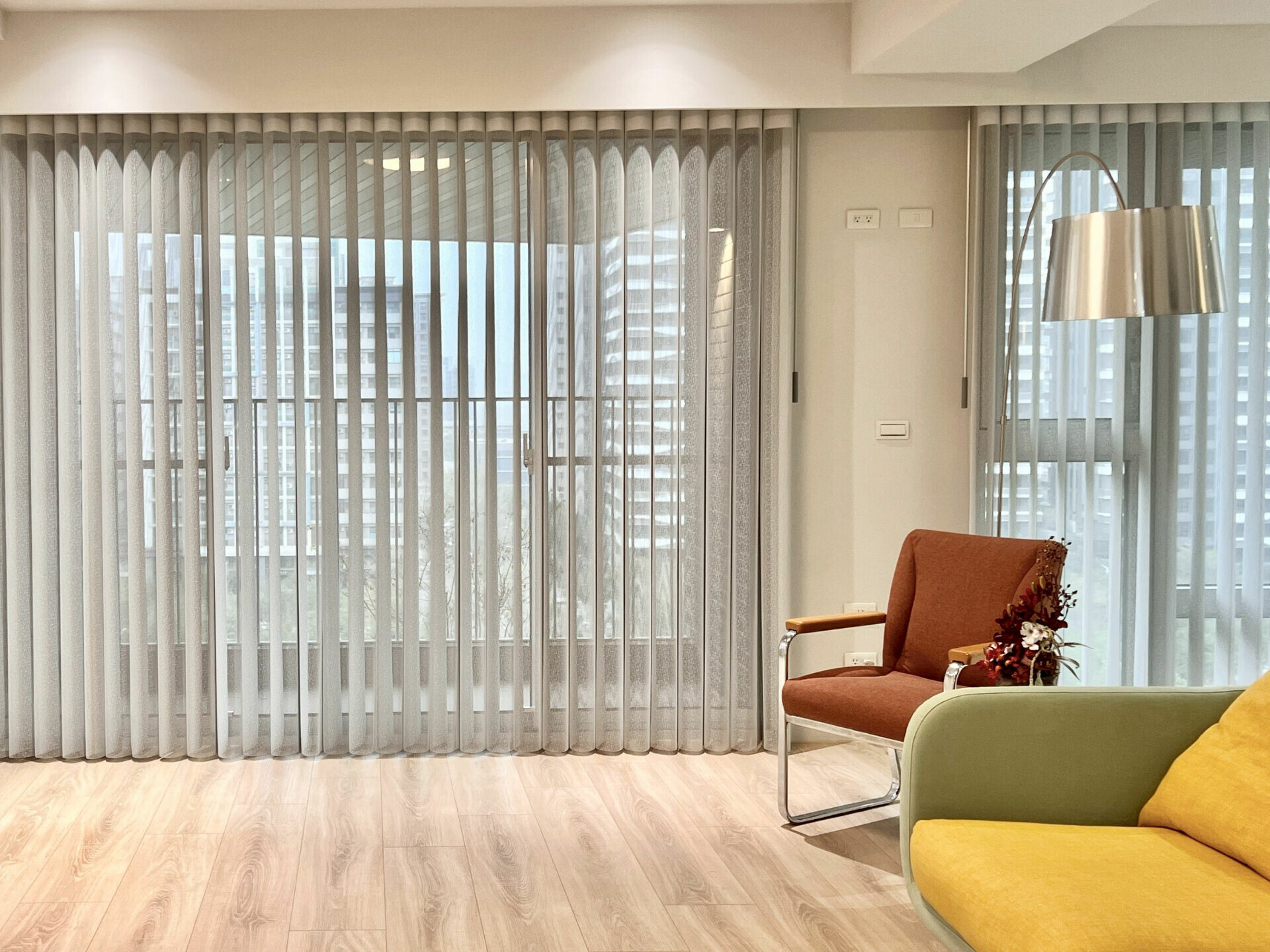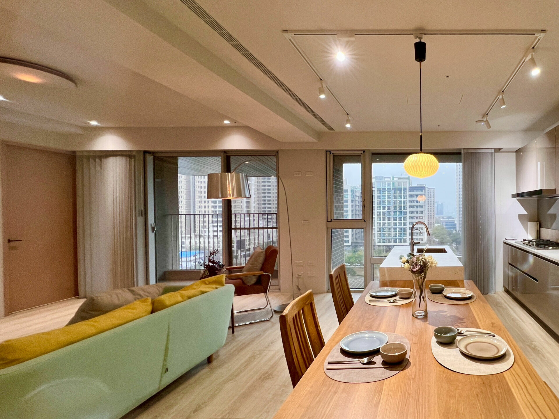 綾設計:因為屋主一年實際居住時間只有三到六個月,空間不需要被家具填滿。客餐廳採開放式設計,減少固定配置,讓空間保持通透。牆面選用日本關西塗料,能調節濕氣、淨化空氣,對長時間未入住的住宅非常重要。窗簾則使用直立柔紗簾,透過簡單推動就能調整遮光程度,讓公園的綠意可以引景入室。