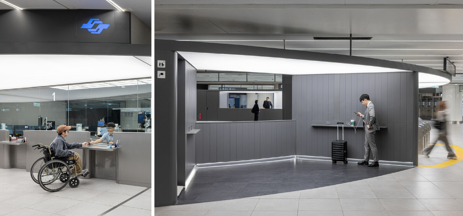 不同於中山站,此次台北車站的設計將「服務盒」模組進一步變形並擴大應用!在基地條件受限的情況下,團隊巧妙運用圓弧形服務盒包覆部分圓柱,重新整理服務界面,柔化車站多處邊角邊界,使空間動線更為流暢,同時釋放更多流通面積,有效舒緩人潮動線。此外,設計也善用服務盒本體的深度,創造多元服務機能空間,包含儲藏室、商業櫃位、會面點、充電服務、垃圾桶與指標電子螢幕等設施,讓有限的空間在整合與秩序中展現更高的使用效能。