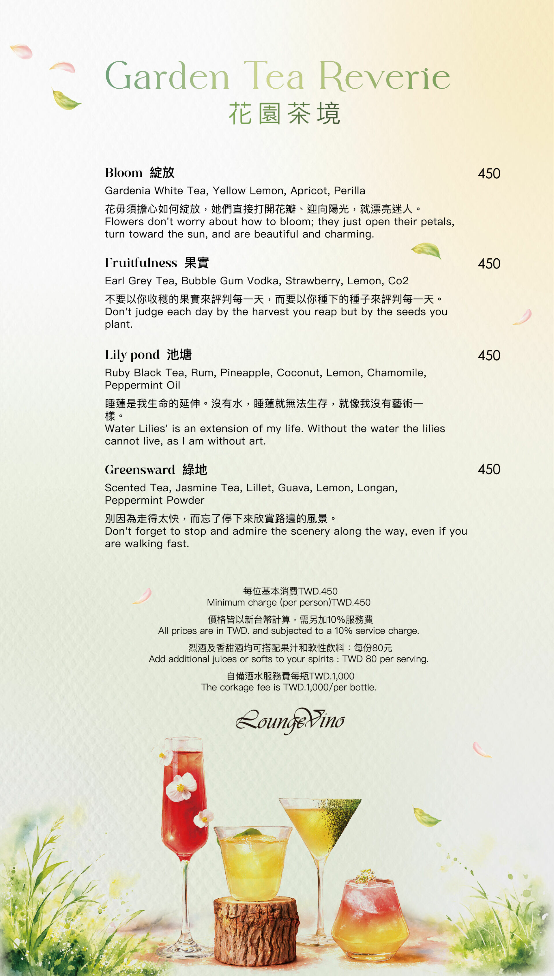 四款春季主題調酒(每杯 $450 +10%),以花香、果實、池塘與綠地為靈感,替每一段台北夜色寫下不同的註解。