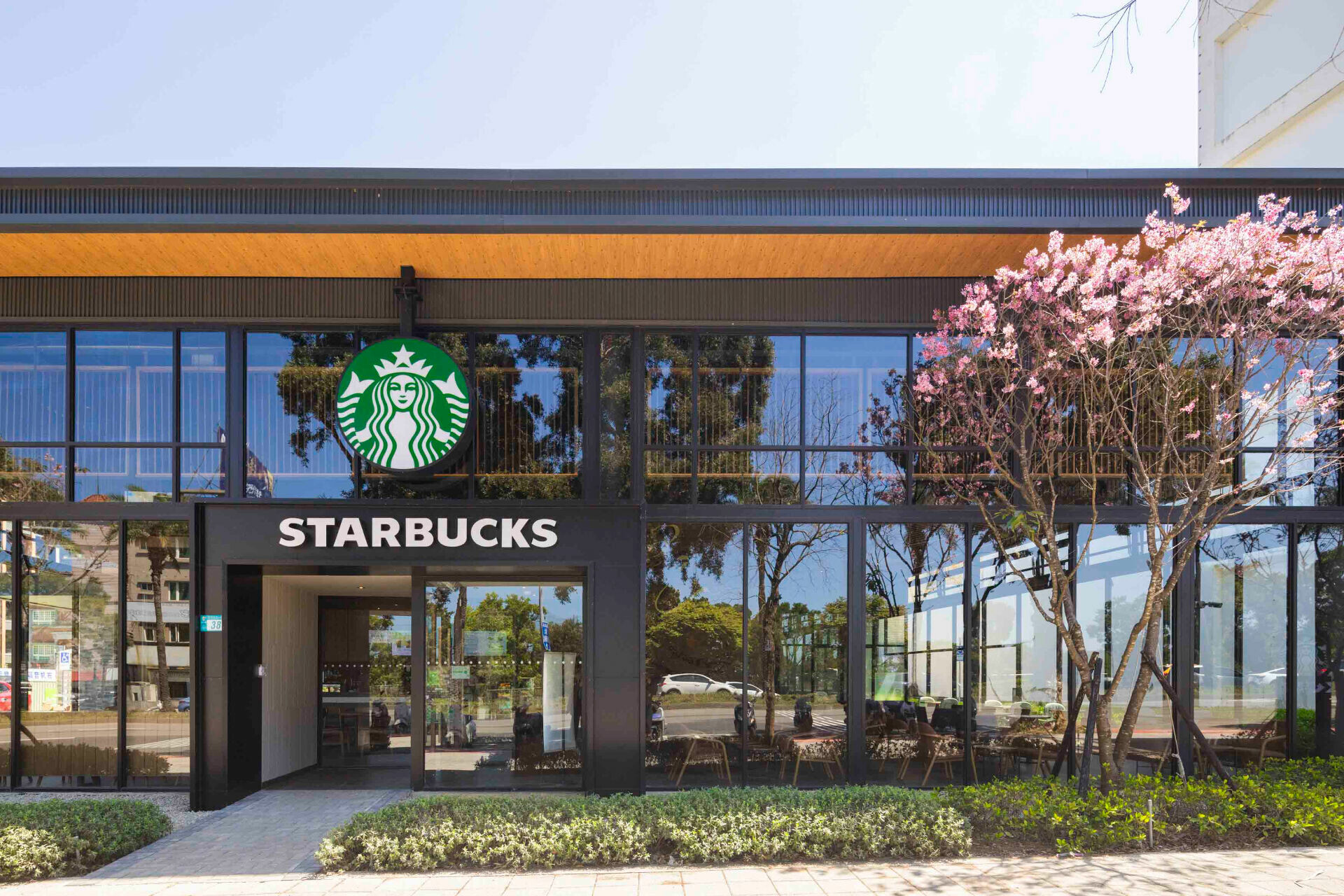 門市周邊特別種植三株富士櫻,每逢櫻花季來臨,粉色花朵盛開綻放,在玻璃立面引入的自然光映照下,營造出宛如「森林中的玻璃盒」般夢幻景致,顧客於門市內即可欣賞櫻花美景,並在品味咖啡的同時,感受粉嫩櫻花雨交織而成的春日浪漫氛圍。