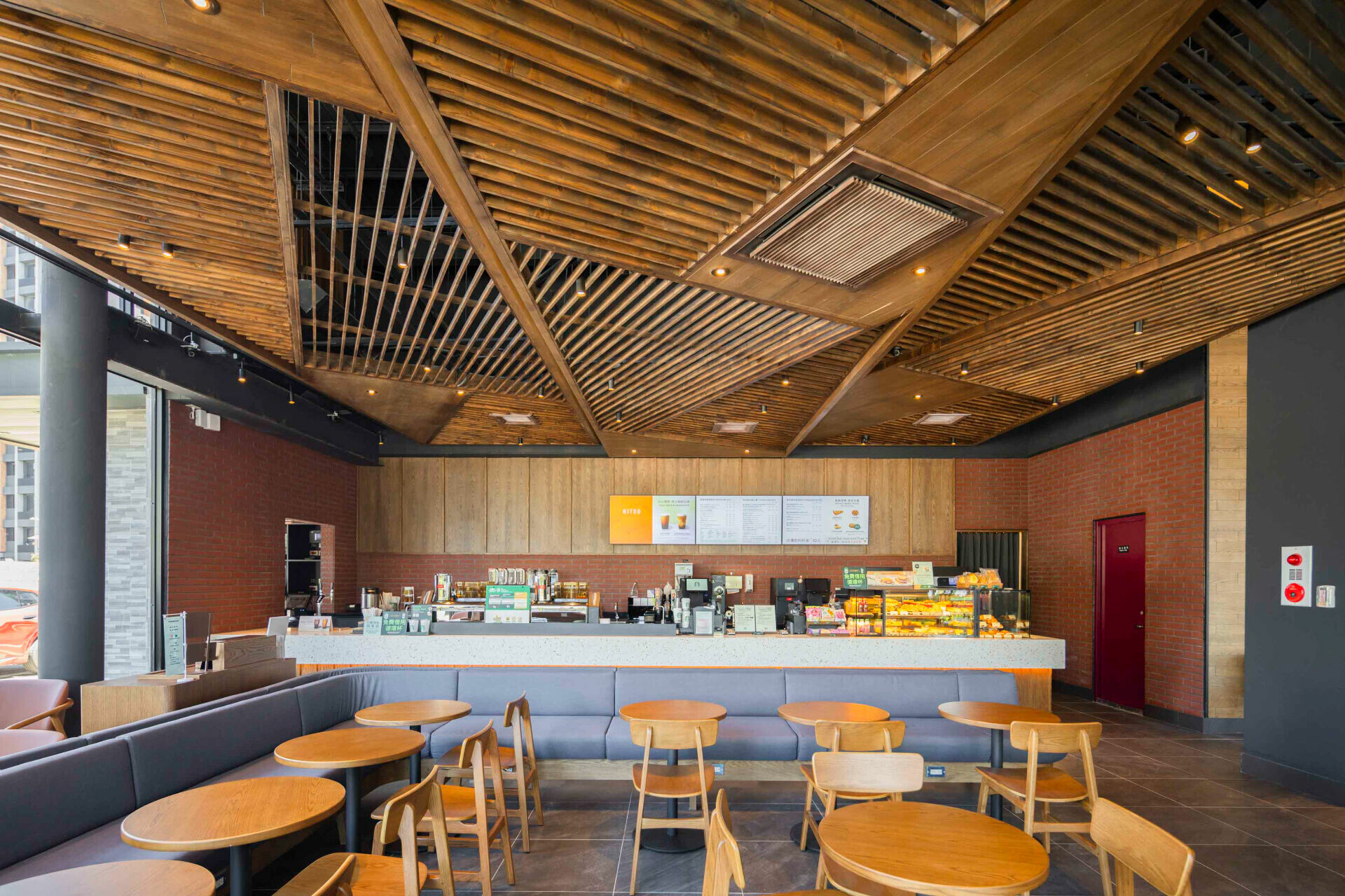 門市外觀以「森林中的玻璃盒」為設計概念,整體採大地色系與開放式天花設計,搭配簡約背景與線性木質框架,透過玻璃引入漫射自然光,與幾何線條交錯產生 「動與靜」的光影對比,彷彿置身於森林中觀賞著樹冠的光影變化,增加視覺趣味及空間律動感,讓顧客在品味咖啡之餘,也能沉浸於春日賞櫻的悠然時光。