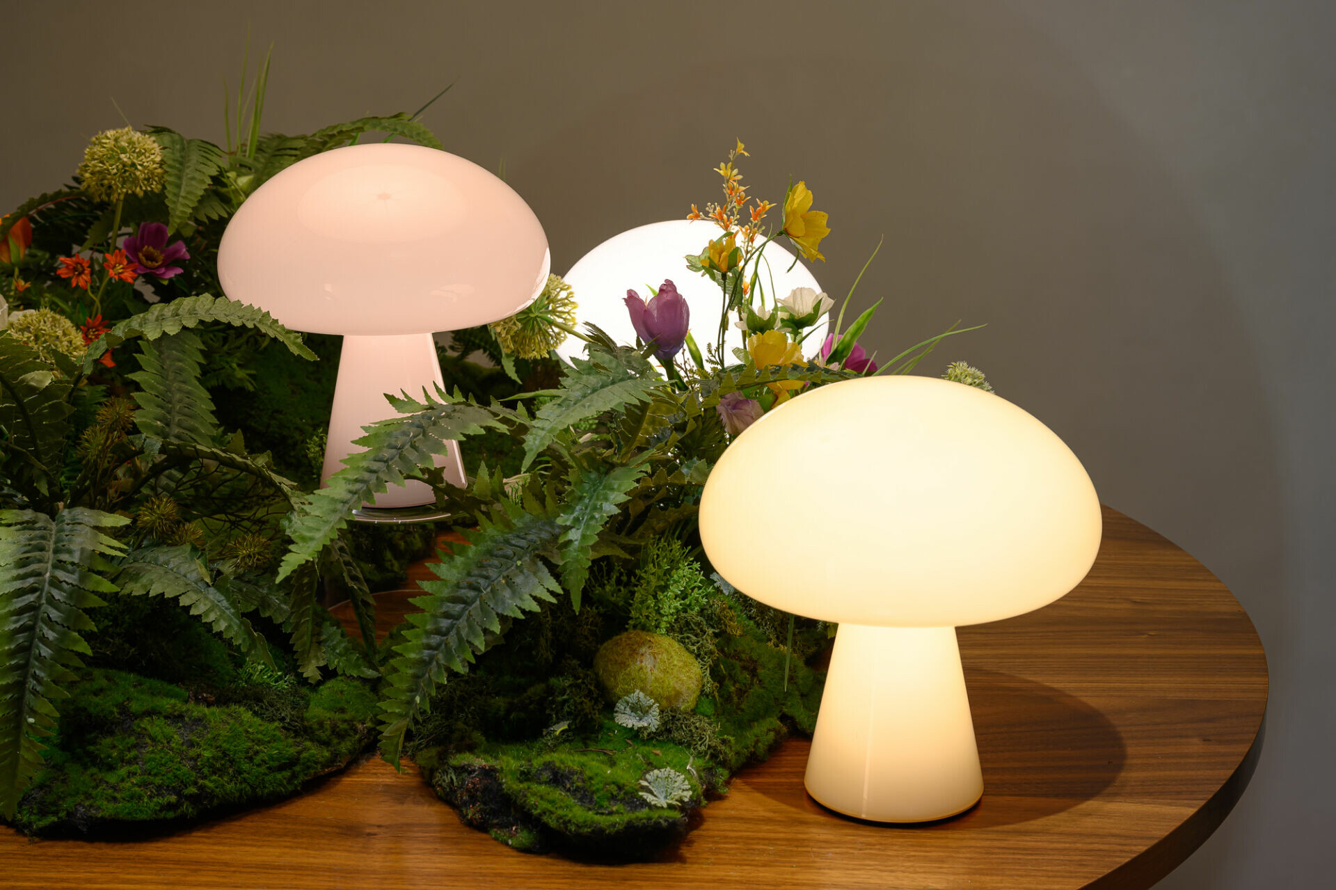 本次開幕同步揭曉 GUBI 多款新品,其中美國設計師 Bill Curry(1927-1971)的經典 Obello 桌燈系列格外亮眼。這款 1971 年設計的標誌性蘑菇造型燈具,以輕盈流線的磨砂口吹玻璃燈體,呈現細膩手工質感與溫潤光暈。