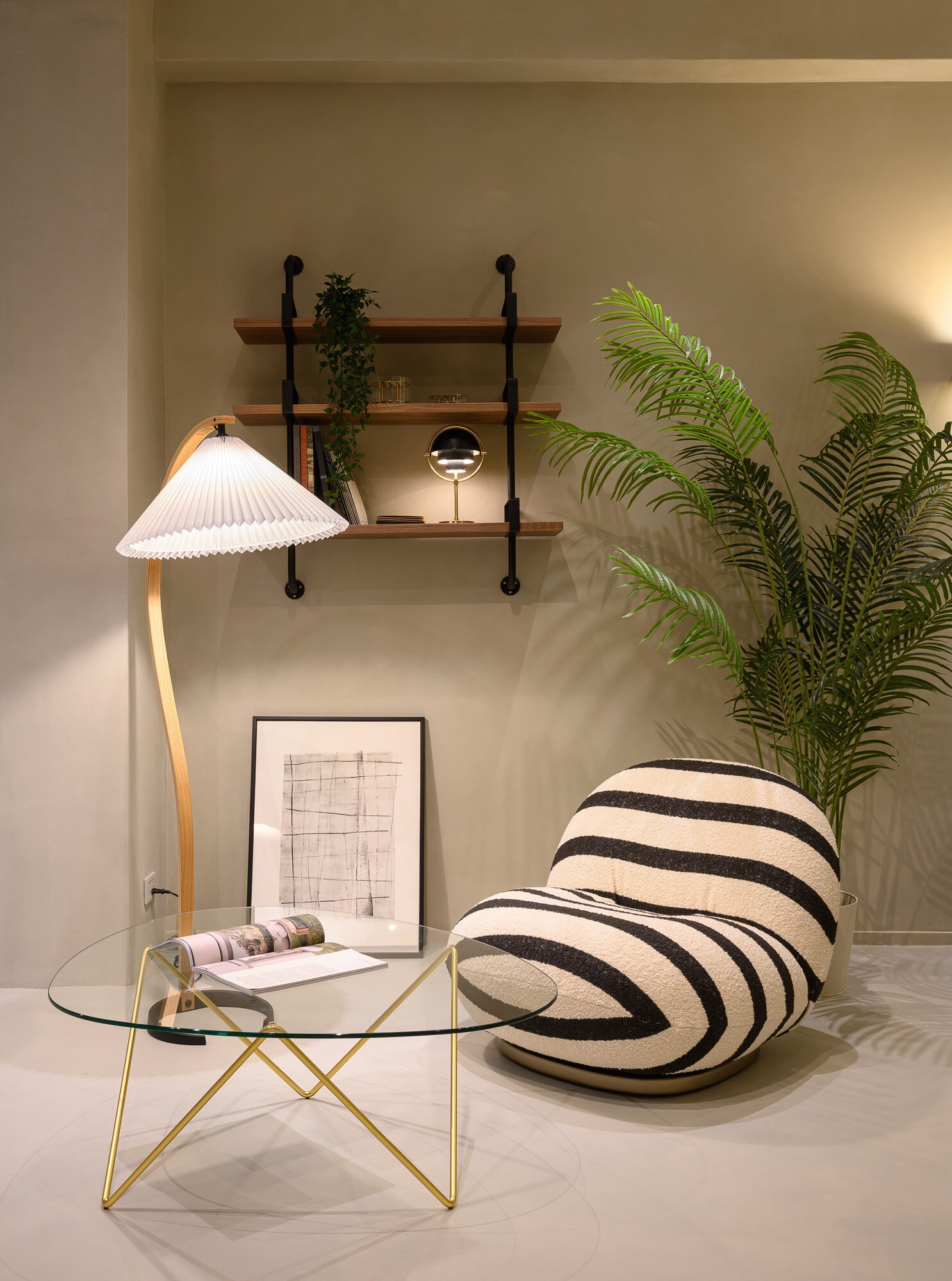 走進空間,室內以柔和中性色調鋪陳基底,沙發、餐椅與燈飾彷彿被置入日常的一幕幕片段,而非僅僅陳列品。你可以坐下、試躺、改變視角,看見同一件家具在不同距離與高度下的表情。這種「邀請你停留」的節奏,也正是 GUBI 想帶進台北的生活態度。