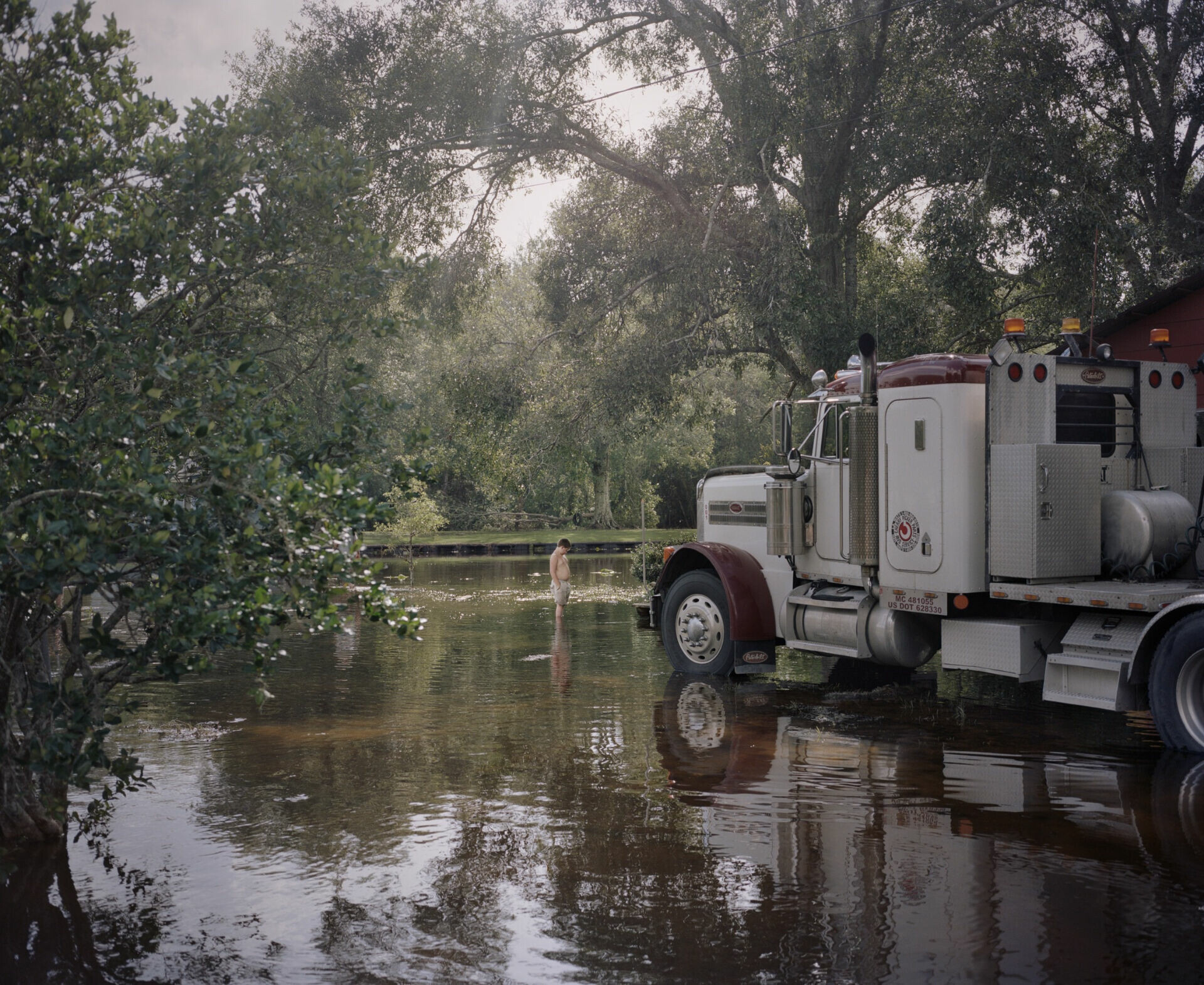 漢娜・莫迪(Hannah Modigh)的《颶風季》聚焦於美國路易斯安那州南部的日常,精確捕捉了那股懸而未發的緊張感,以及潛藏在平靜表象下的不安、恐懼與集體憤怒。博杜安・穆安達(Baudouin Mouanda)的作品則回溯 2020 年疫情期間,剛果布拉柴維爾遭遇的洪災浩劫,並與災難倖存者展開共創計畫。卡米爾・西曼(Camille Seaman)記錄了震撼人心的「超大胞」(Supercell)雷暴,這類風暴能產生葡萄柚大小的冰雹與壯觀龍捲風,巨大的雲層足以遮蔽天日,留下令人窒息的詭譎靜寂。