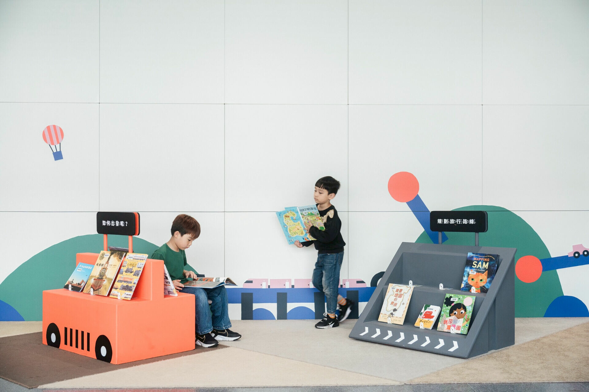 此次主題書展依內容劃分為六大子題:「如何出發呢?」、「規劃旅行路線」、「一起遊樂玩耍」、「探索文化采風」、「開啟城市之旅」以及「不一樣的旅行」。透過主題分類,觀眾得以從不同角度理解旅行的多重面向,包括交通工具的想像、空間與時間的地圖概念、文化差異帶來的感知經驗,以及在城市移動中累積的記憶片段。選書同時涵蓋故事與知識類型,並納入多語言與無字繪本,呈現旅行經驗的多樣性與開放性。