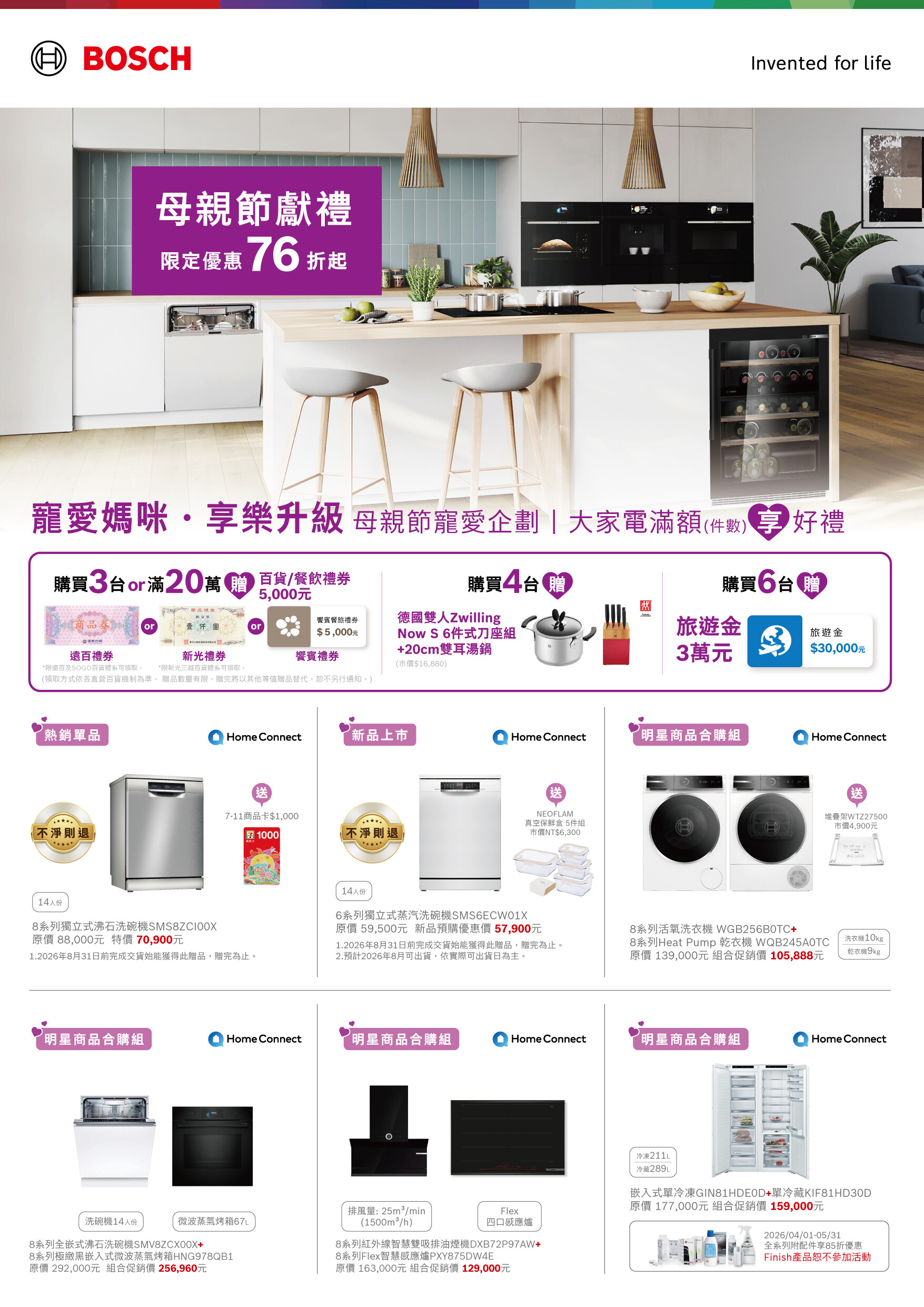Bosch 8 系列與 6 系列獨立式洗碗機等熱銷商品組合,不僅享有 8 折起優惠,購機再贈 7-11 商品卡或真空保鮮盒 5 件組(市價 NT$6,300);而鎖定全方位烹飪需求的家庭,8 系列獨立式洗碗機搭配嵌入式微波烤箱更享有 88 折組合價,讓消費者在體驗高效廚電科技的同時,也能享受更多超值回饋。活動詳情可洽官網:https://www.bosch-home.com.tw/specials/2026-mothers-day